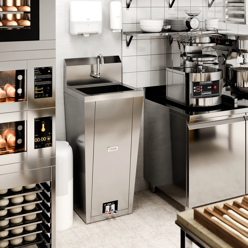 Easy to install, clean, and maintain, this hands-free sink with a pedestal base is a reliable and space-saving handwashing solution, ensuring convenience and hygiene in any environment.