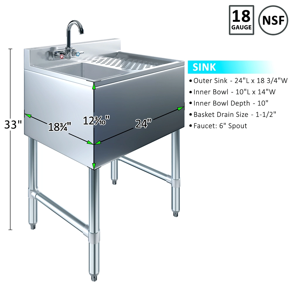 Introducing the 10″ X 14″ X 10″ One Compartment Under Bar Sink with 12″ Right Drainboard and Faucet – a versatile and essential addition to any bar or kitchen environment. Constructed from 18GA/304 stainless steel, this sink ensures exceptional durability and resistance, maintaining its sleek and modern appearance even under heavy use.