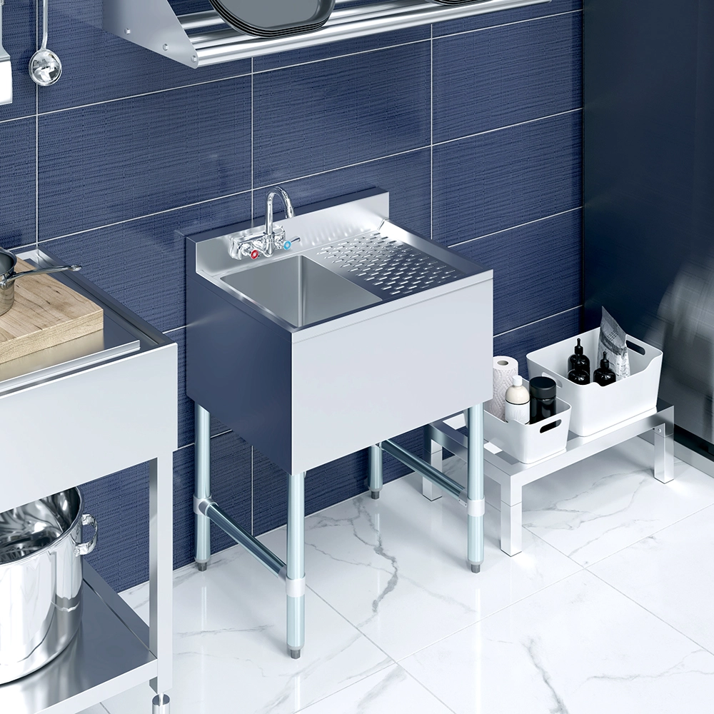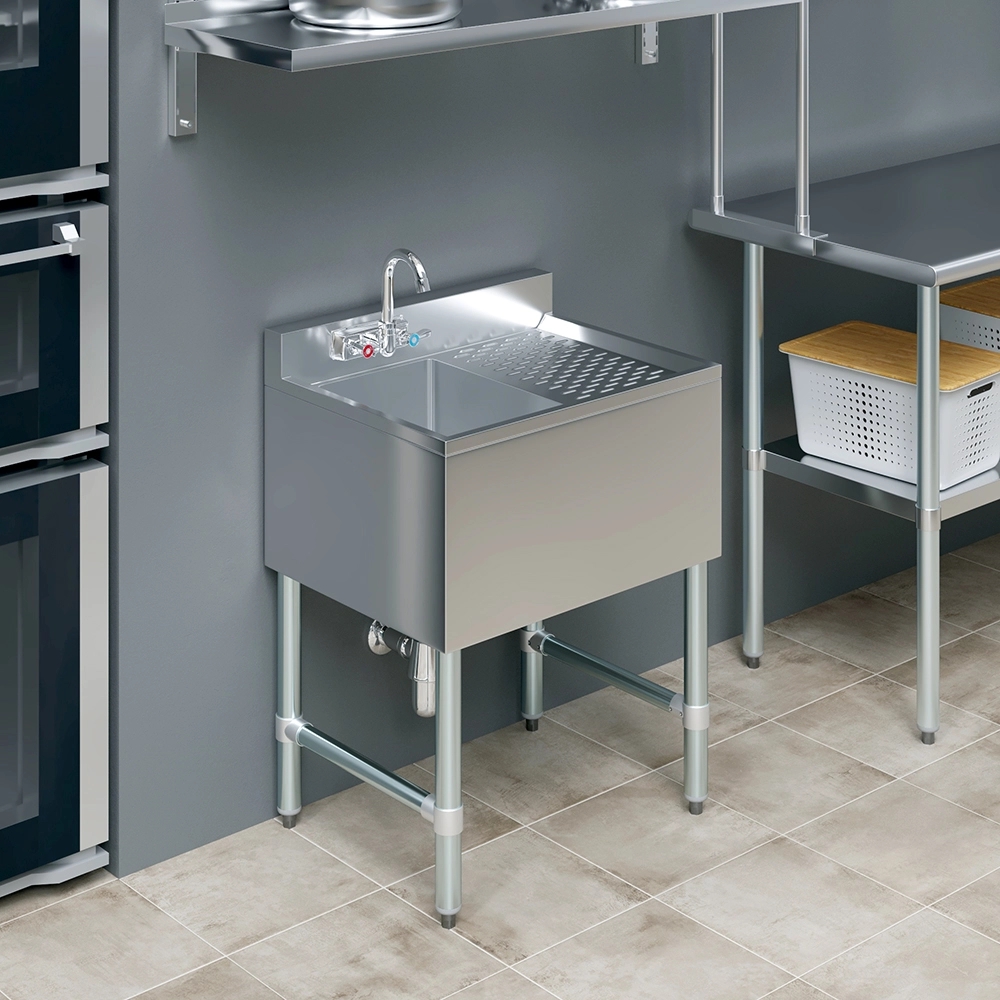The sink features a single 10″ x 14″ compartment with a 10″ depth, perfect for a variety of tasks such as washing glassware, utensils, and prepping ingredients. Its compact size is designed to fit seamlessly into smaller spaces, making it an ideal choice for bars, cafes, restaurants, and home kitchens where space optimization is crucial.
