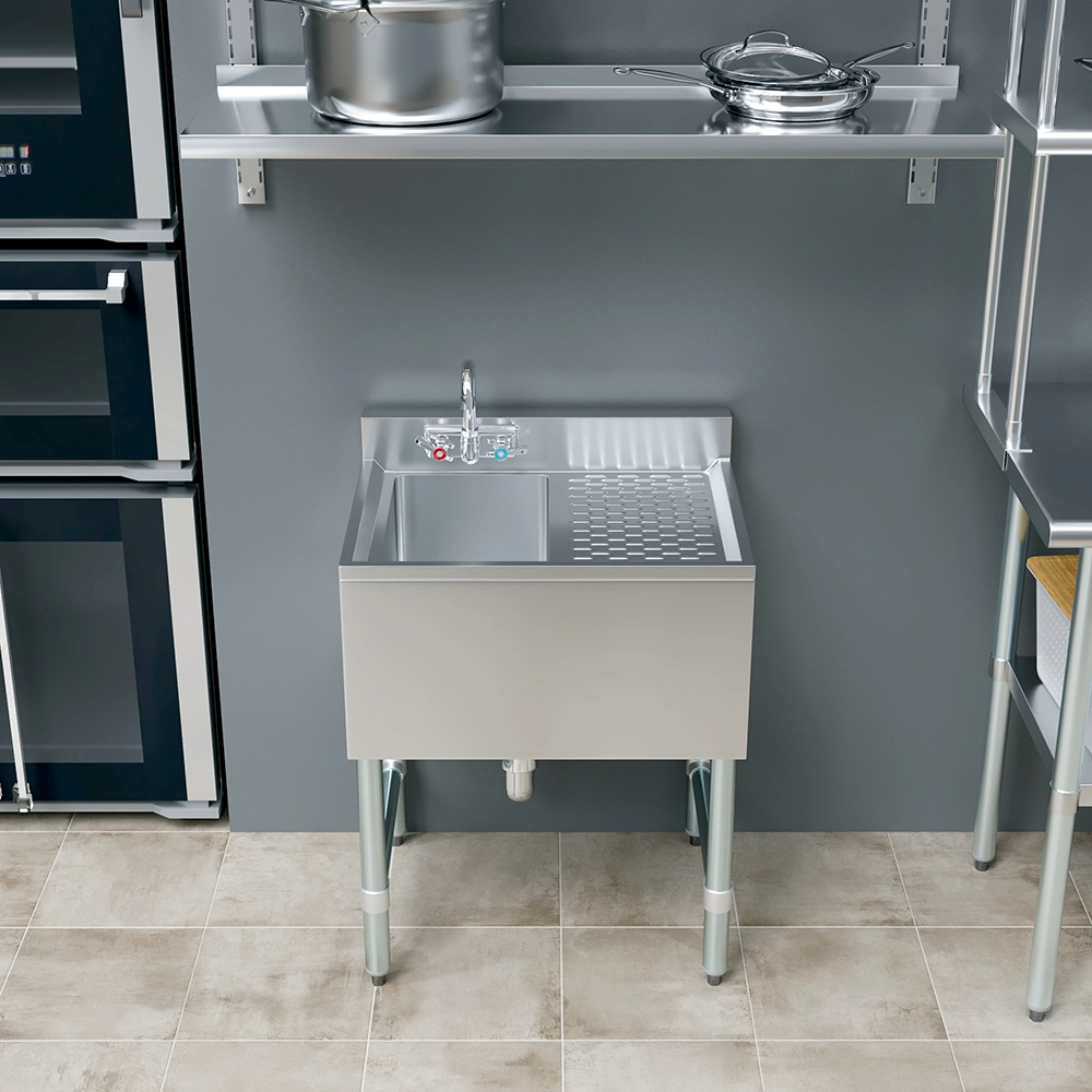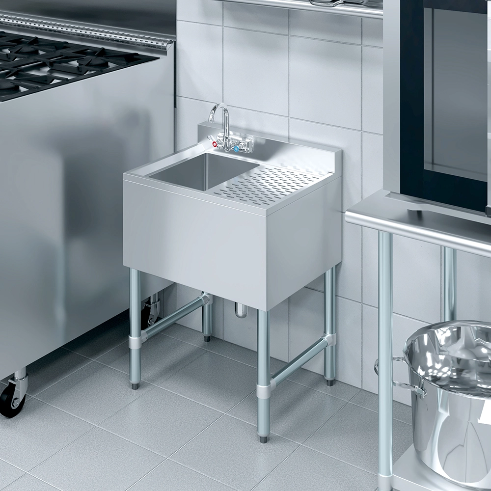 The 12″ right drainboard offers additional convenience, providing ample space for drying and staging items, thereby streamlining your workflow. The integrated faucet delivers a steady and controlled water flow, making rinsing and cleaning tasks more efficient. The faucet’s ergonomic design ensures ease of use and reliability, essential for busy environments.