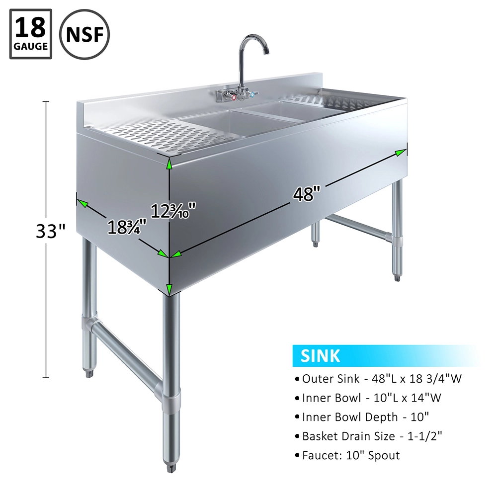 The sink features a dual 10″ x 14″ compartment with a 10″ depth, providing ample space for washing glassware, utensils. Its compact size makes it an excellent choice for bars, restaurants, cafes, and home kitchens where space is at a premium.