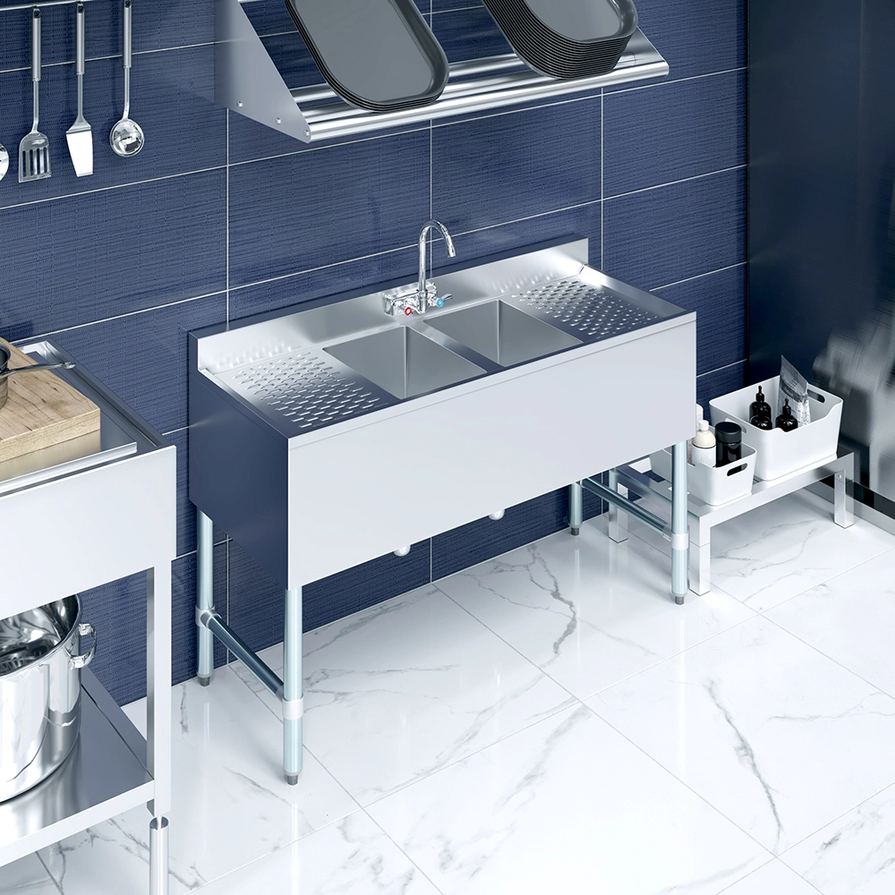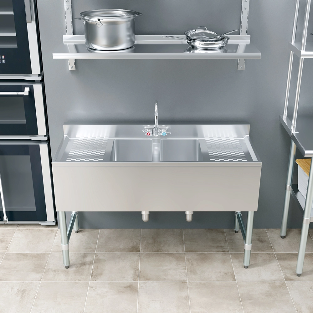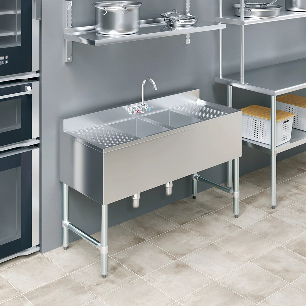 The standout feature of this sink is the dual 12″ drainboards on both the left and right sides. These drainboards offer extensive space for drying, organizing, and prepping items, significantly enhancing your workflow and efficiency. The integrated faucet provides a steady and controlled water flow, making rinsing and cleaning tasks effortless. The ergonomic design of the faucet ensures ease of use and reliability, which is crucial in busy environments.