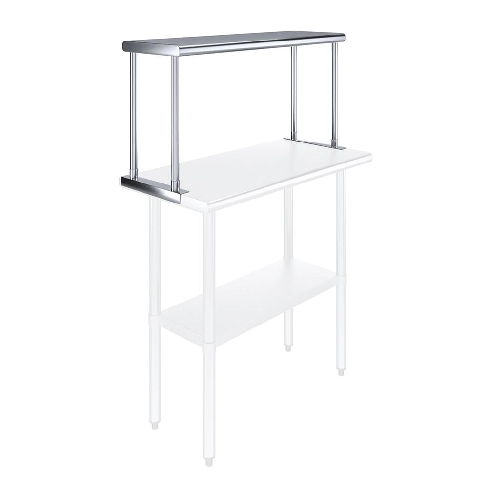This single-tier overshelf provides additional storage space above prep tables, workstations, or countertops, keeping essential tools, ingredients, or small appliances within easy reach. Its sturdy construction supports heavy-duty use, making it ideal for restaurants, bakeries, catering businesses, and food service establishments.