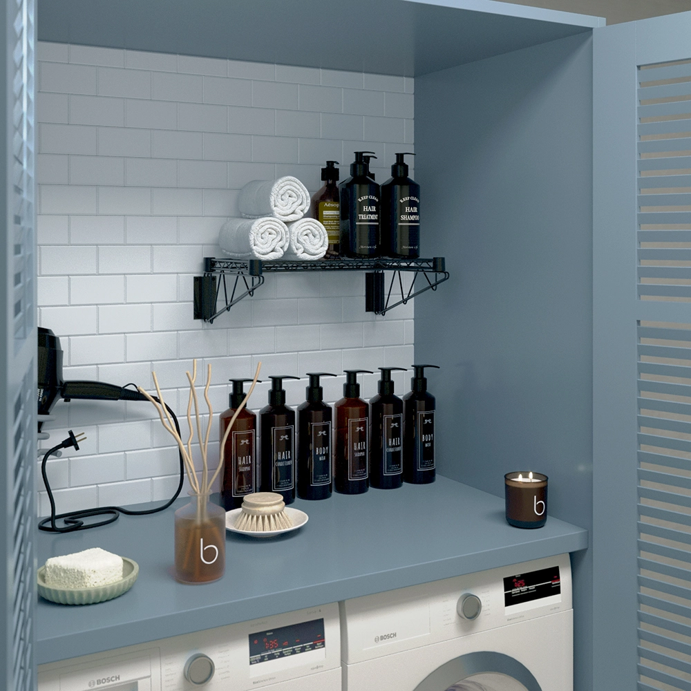 This wall-mounted shelf includes sturdy brackets for secure installation, providing reliable support and stability. It is perfect for storing kitchen essentials, cookware, cleaning supplies, tools, or decorative items. Its sleek black finish adds a modern, professional touch to any space.