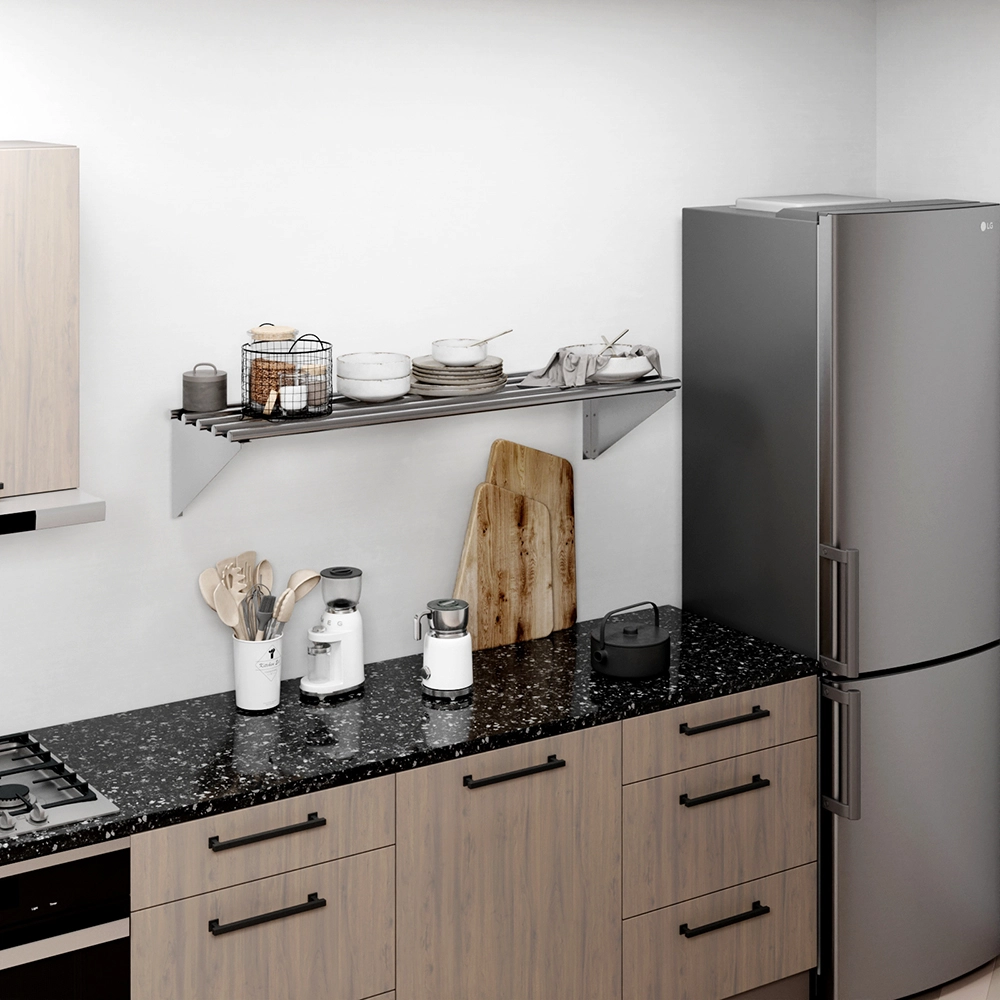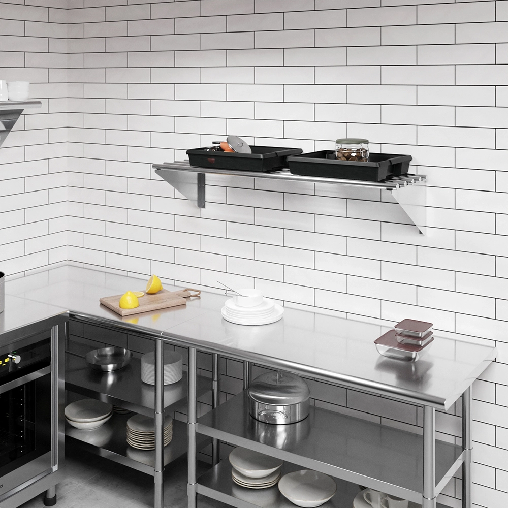 The stainless steel construction is not only durable but also easy to clean, maintaining hygiene and a polished look in any setting. This makes it particularly suitable for kitchens and food preparation areas, where cleanliness is essential. The shelf’s sleek and minimalist design complements a range of decor styles, from contemporary to industrial.