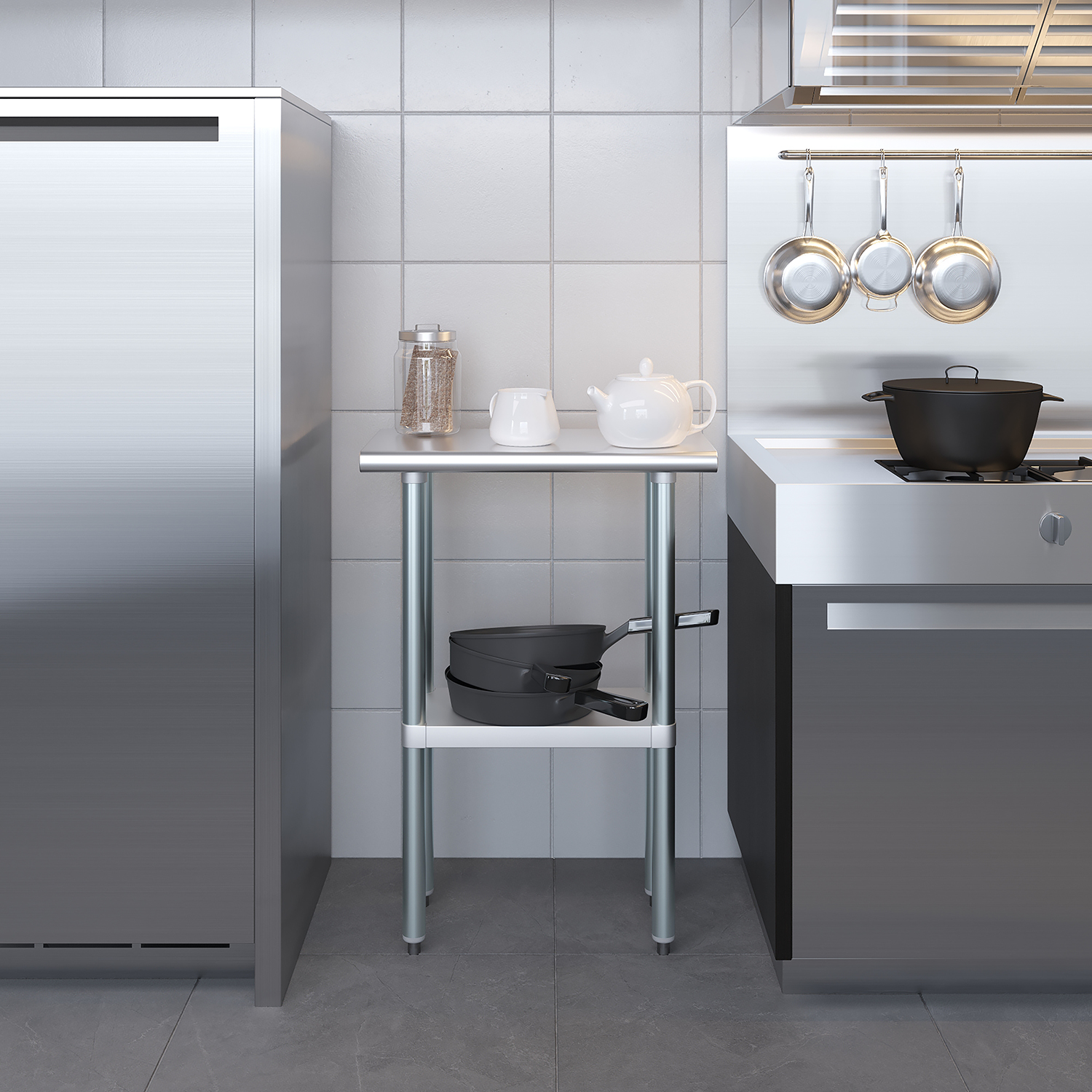 Introducing the 14″ X 24″ Stainless Steel Work Table with Undershelf – a robust and versatile solution for enhancing efficiency and organization in any commercial kitchen, workshop, or utility space. Meticulously crafted from 18GA/430 stainless steel, this work table ensures exceptional durability, resistance and easy maintenance, making it a reliable addition to any professional environment.