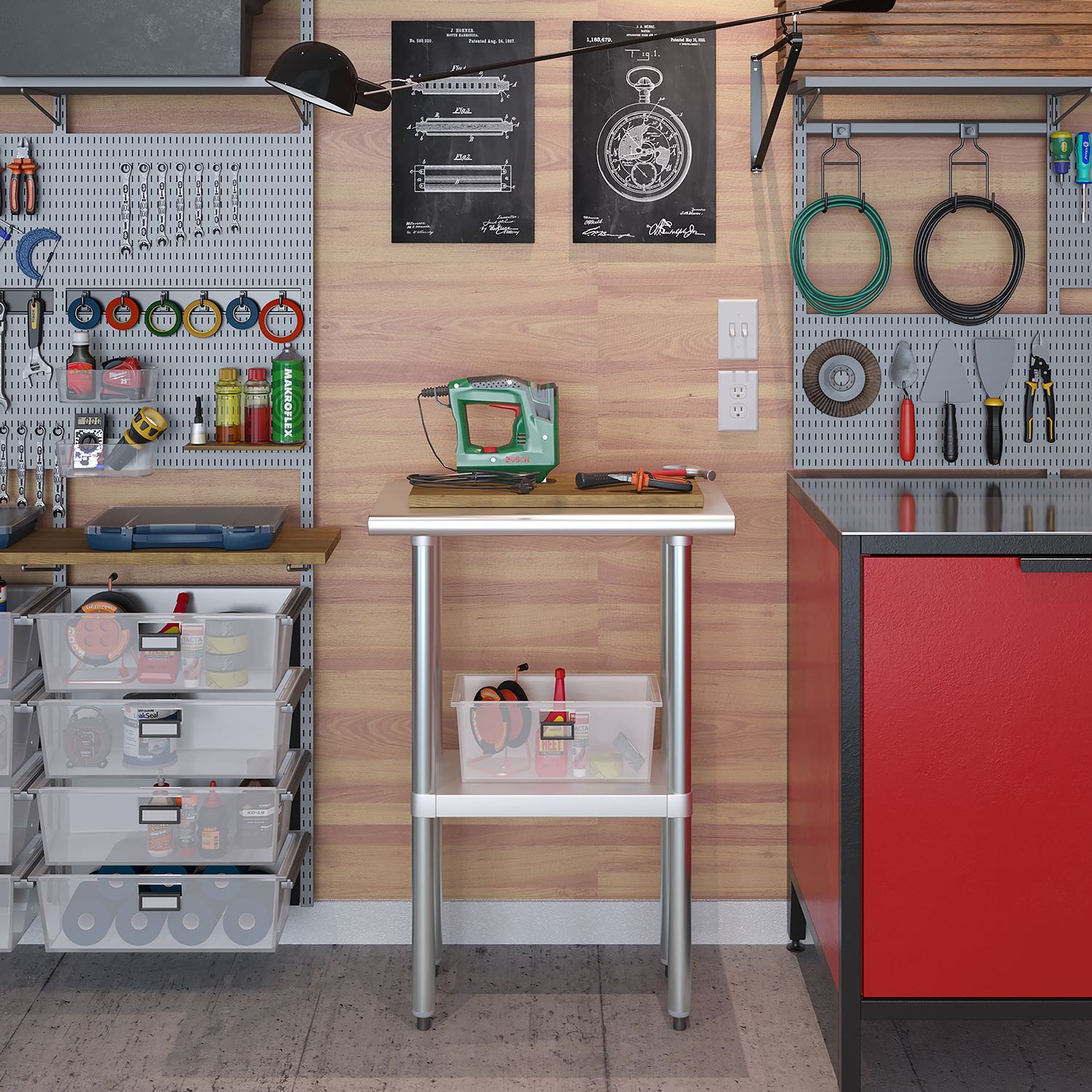 A key feature of this work table is the adjustable undershelf, which offers additional storage space for tools, supplies, and equipment. This undershelf can be positioned at your preferred height, allowing for customized storage solutions that meet your specific needs. Whether you need to store heavy equipment or small utensils, this versatile shelf enhances the functionality of your workspace by keeping essential items within easy reach.