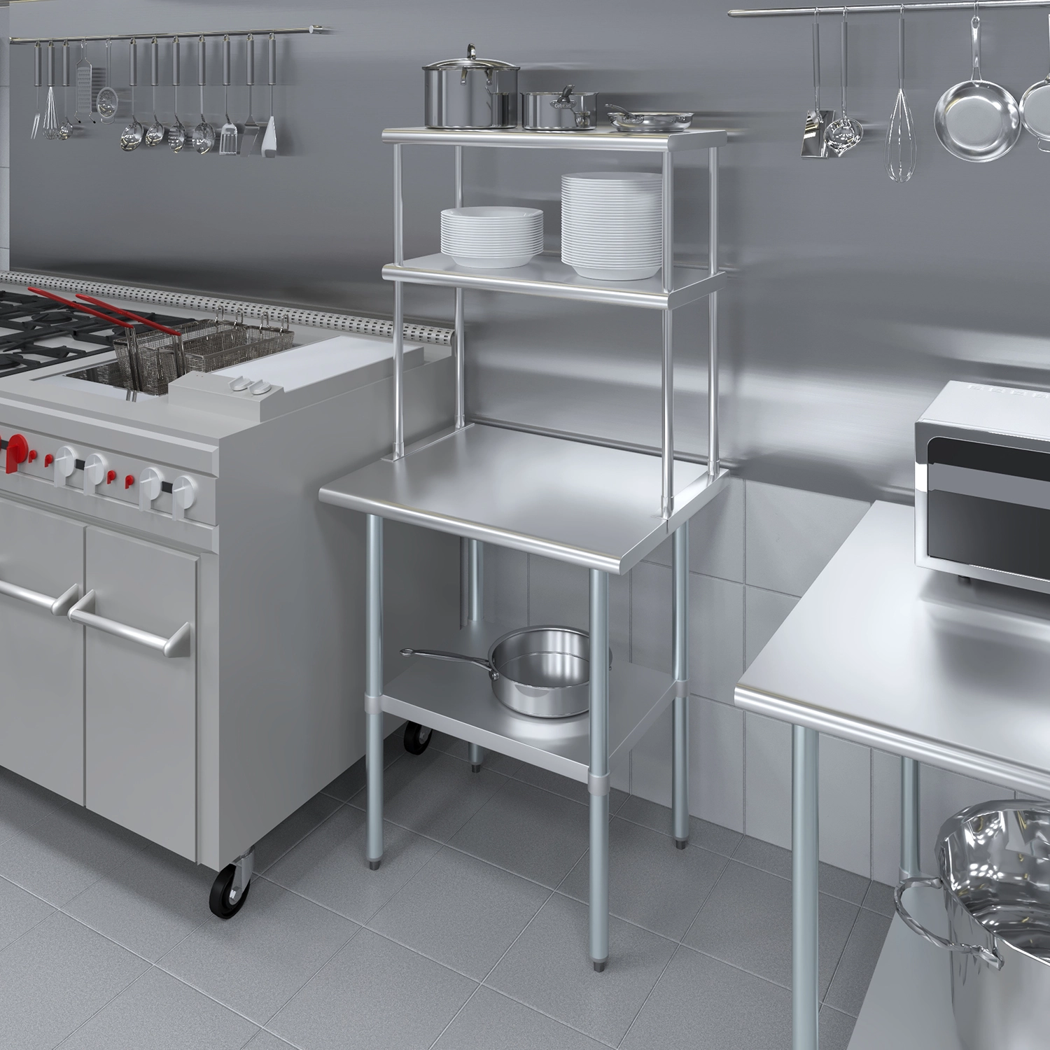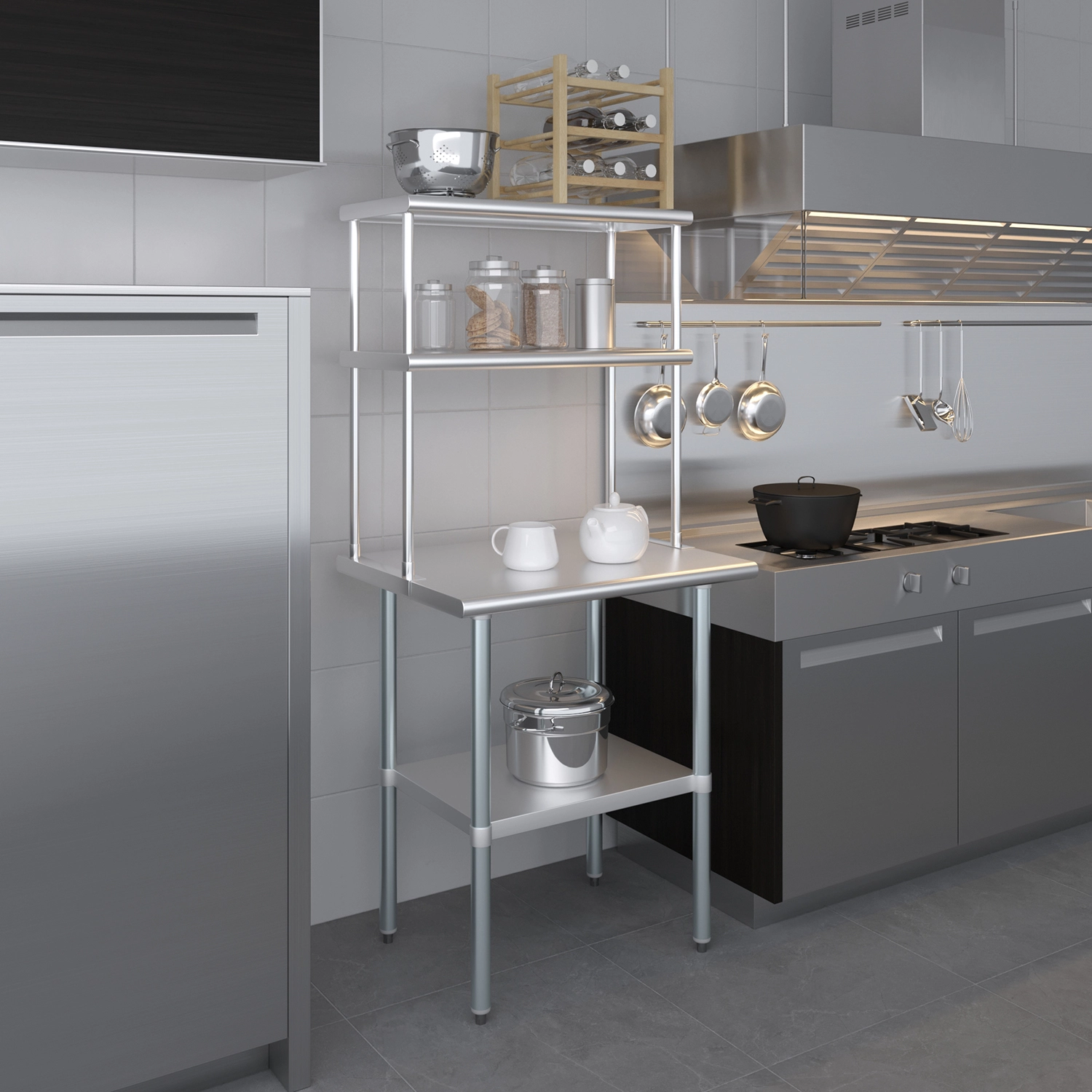 Each shelf is built to support significant weight, thanks to its robust construction, ensuring it can handle heavy-duty use in demanding environments. Whether you need to store bulky pots and pans or delicate ingredients, this shelf provides a reliable and sturdy solution.