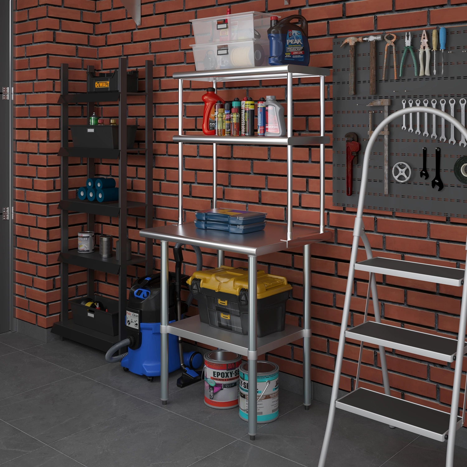 Installation is straightforward, with all necessary mounting hardware included, allowing for quick and easy setup. The versatile design of this double-tier shelf makes it suitable for various applications beyond the kitchen, such as in garages, workshops, or any area where organized storage is essential.