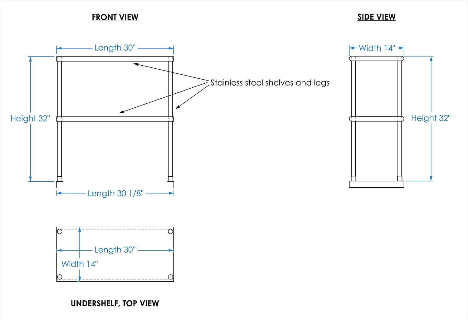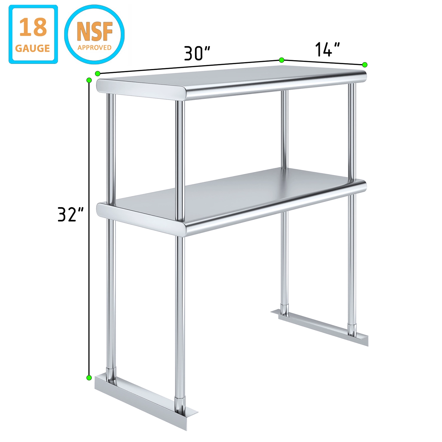 Measuring 14 inches in width and 30 inches in length, this compact yet spacious shelf offers ample storage space across two tiers. The double-tier design maximizes vertical storage capacity, making it ideal for organizing a variety of kitchen essentials, including utensils, ingredients, cookware, and equipment. The open-shelf design allows for easy access and quick retrieval of items, streamlining your workflow and improving productivity.
