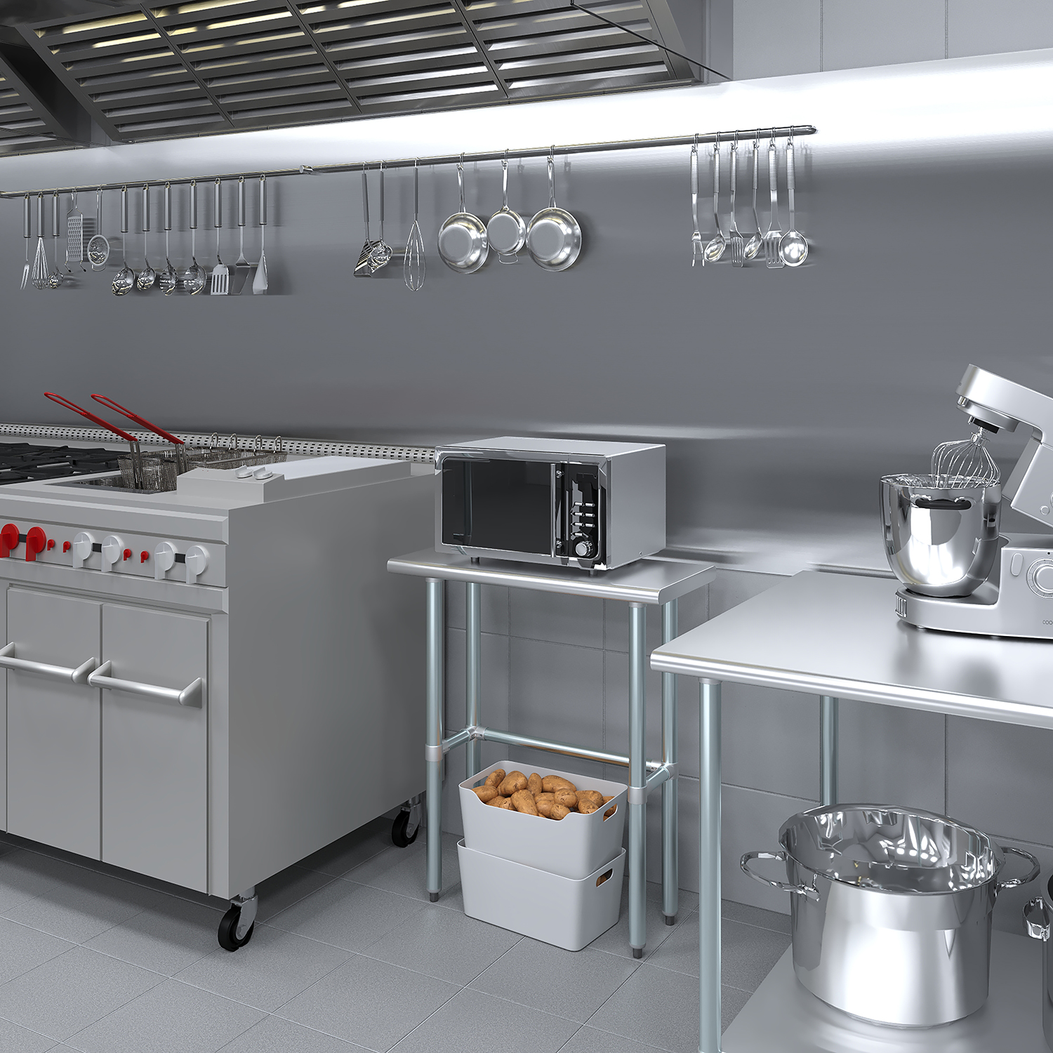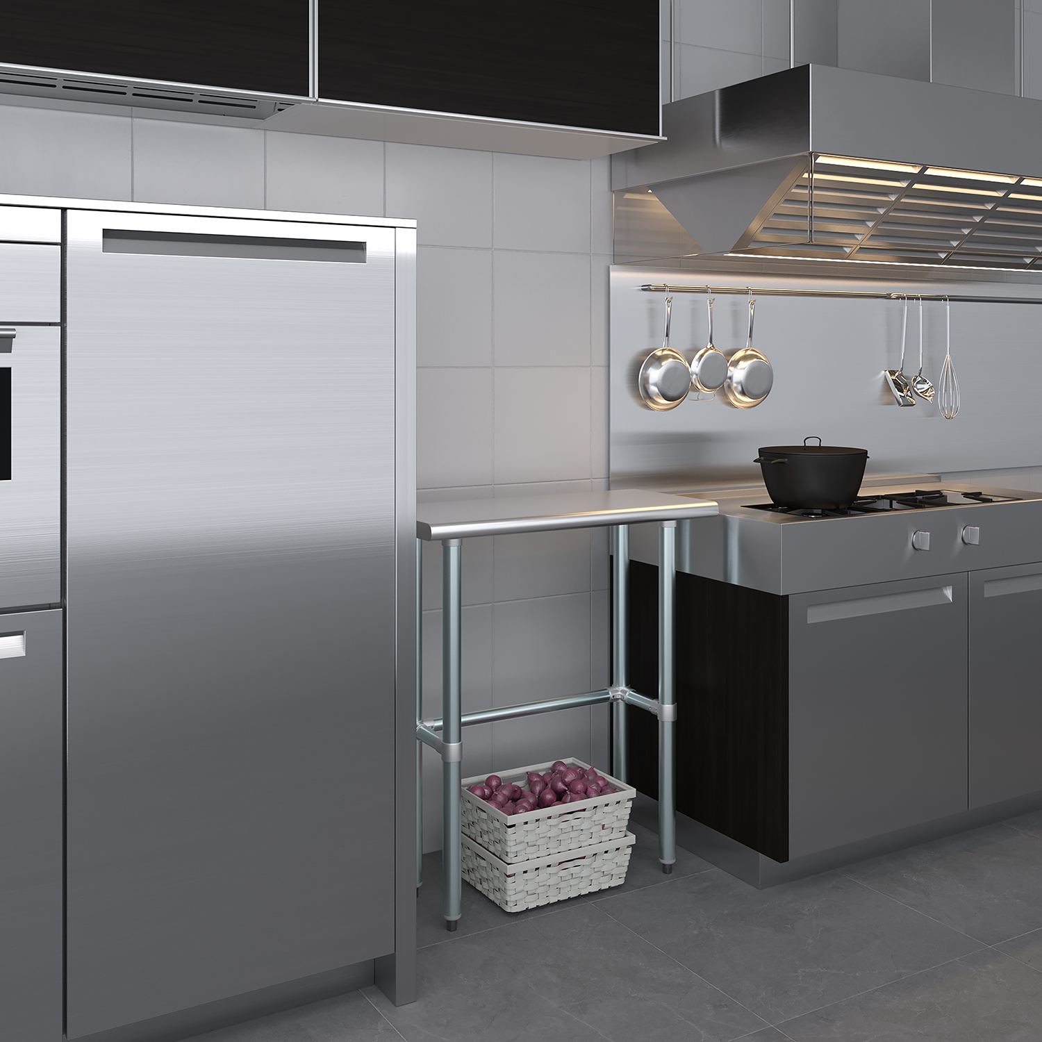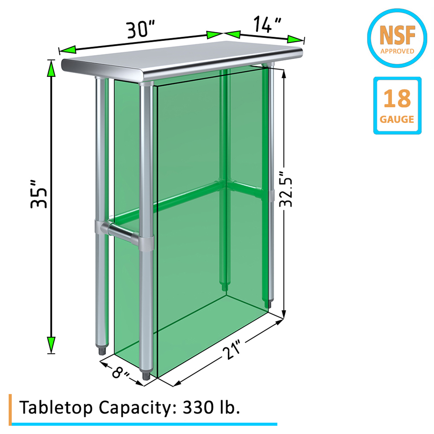 Enhance your workspace with the versatile and durable 14″ x 30″ Stainless Steel Work Table with Open Base. Crafted from 18GA/430 stainless steel, this work table is designed to withstand the rigors of daily use in commercial kitchens, workshops, laboratories, and other demanding environments. Its sleek, smooth surface is not only easy to clean but also resistant, ensuring long-lasting performance and hygiene.