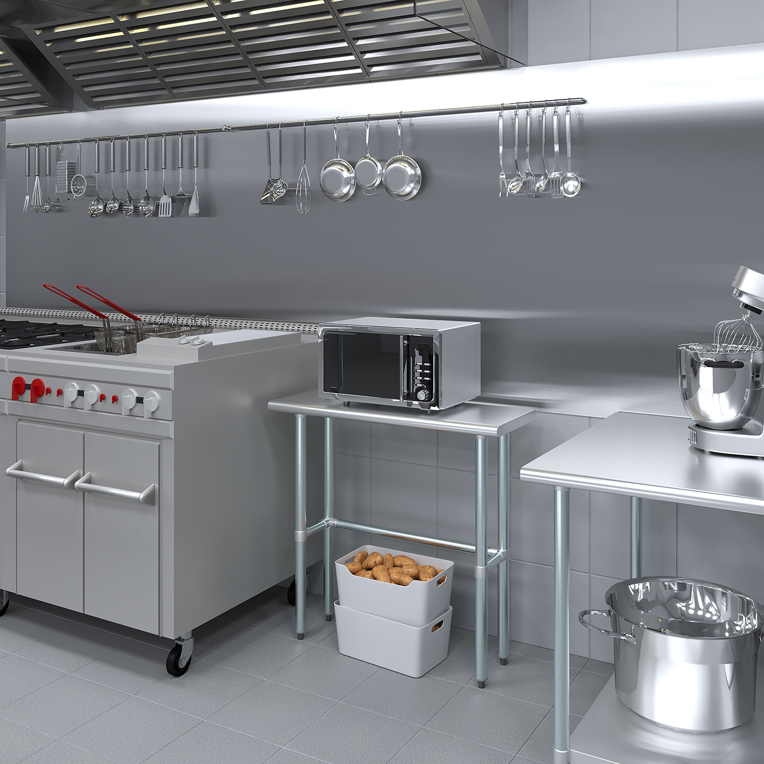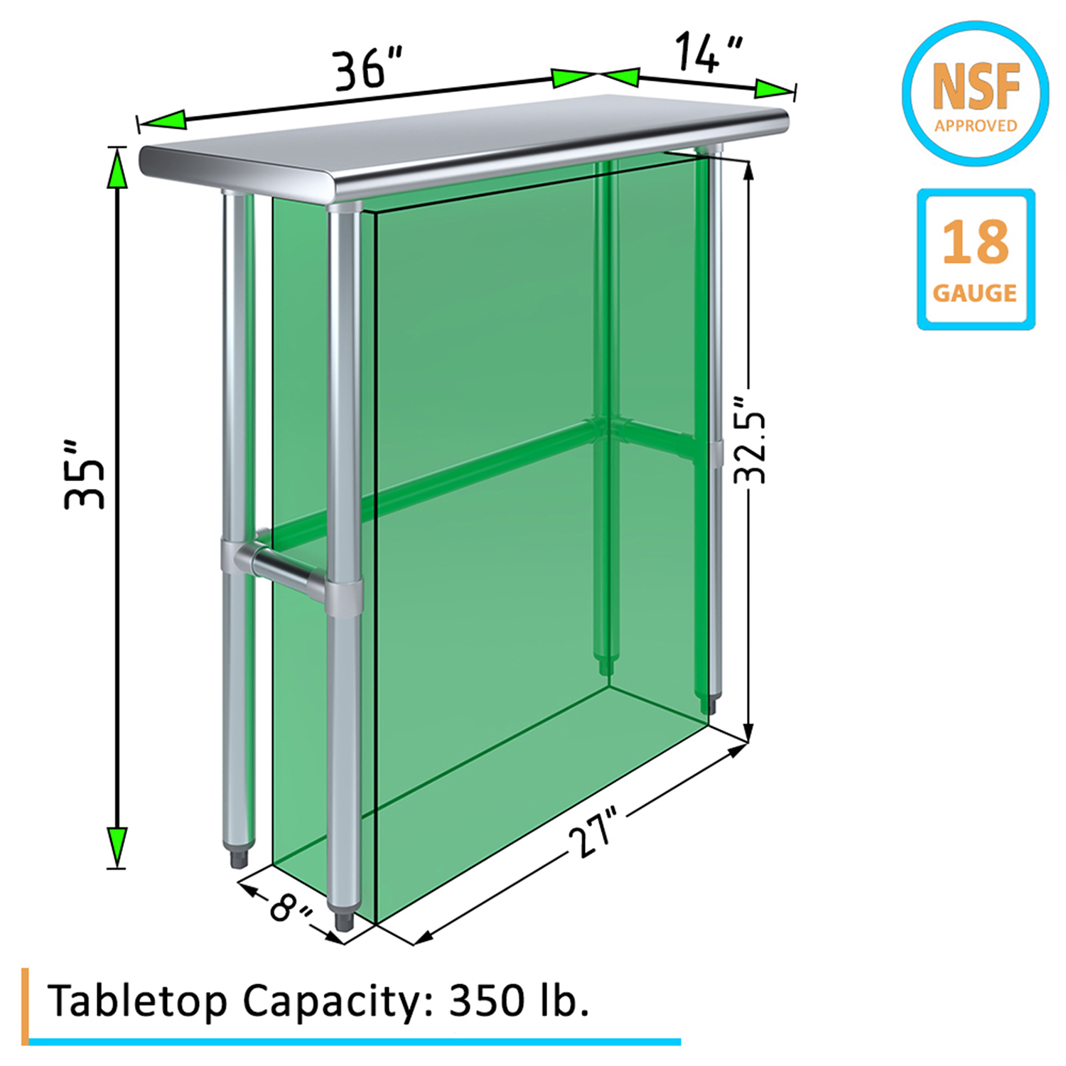 Enhance your workspace with the versatile and durable 14″ x 36″ Stainless Steel Work Table with Open Base. Crafted from 18GA/430 stainless steel, this work table is designed to withstand the rigors of daily use in commercial kitchens, workshops, laboratories, and other demanding environments. Its sleek, smooth surface is not only easy to clean but also resistant, ensuring long-lasting performance and hygiene.