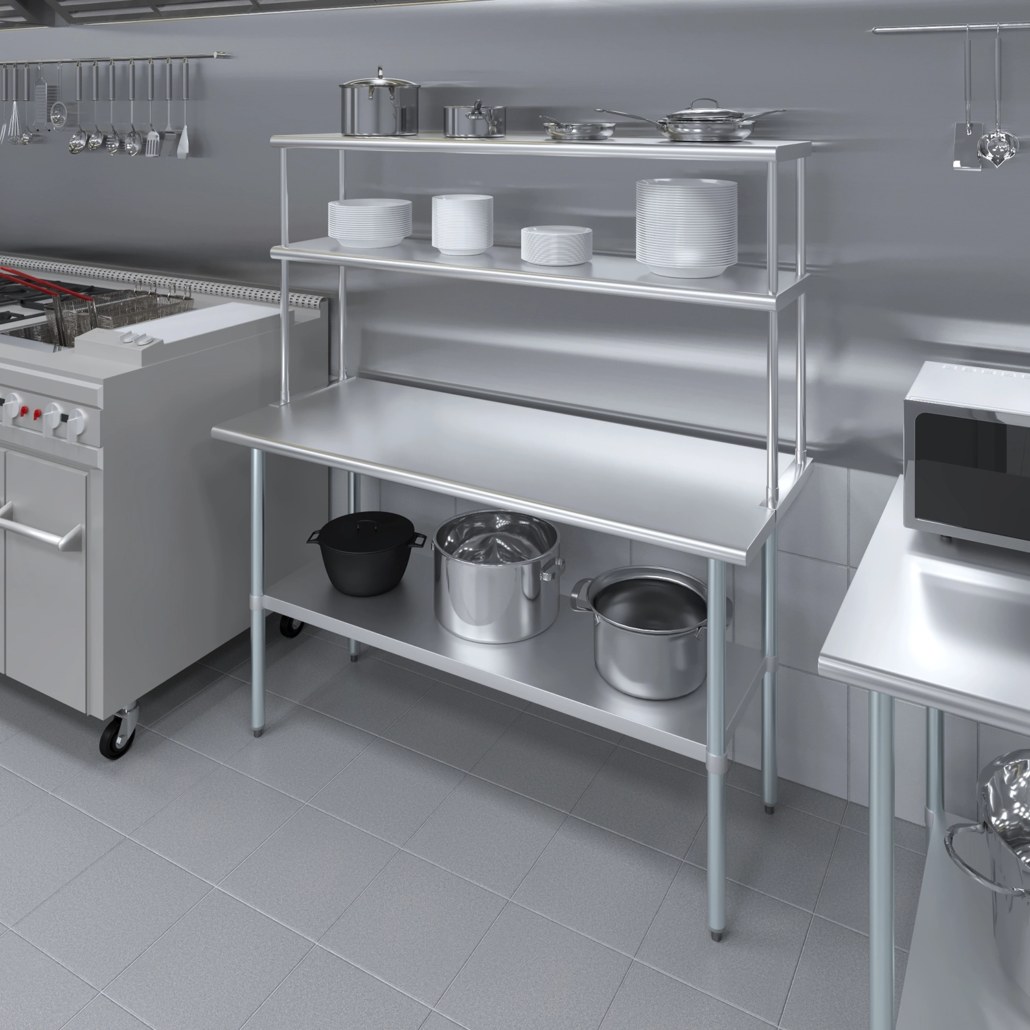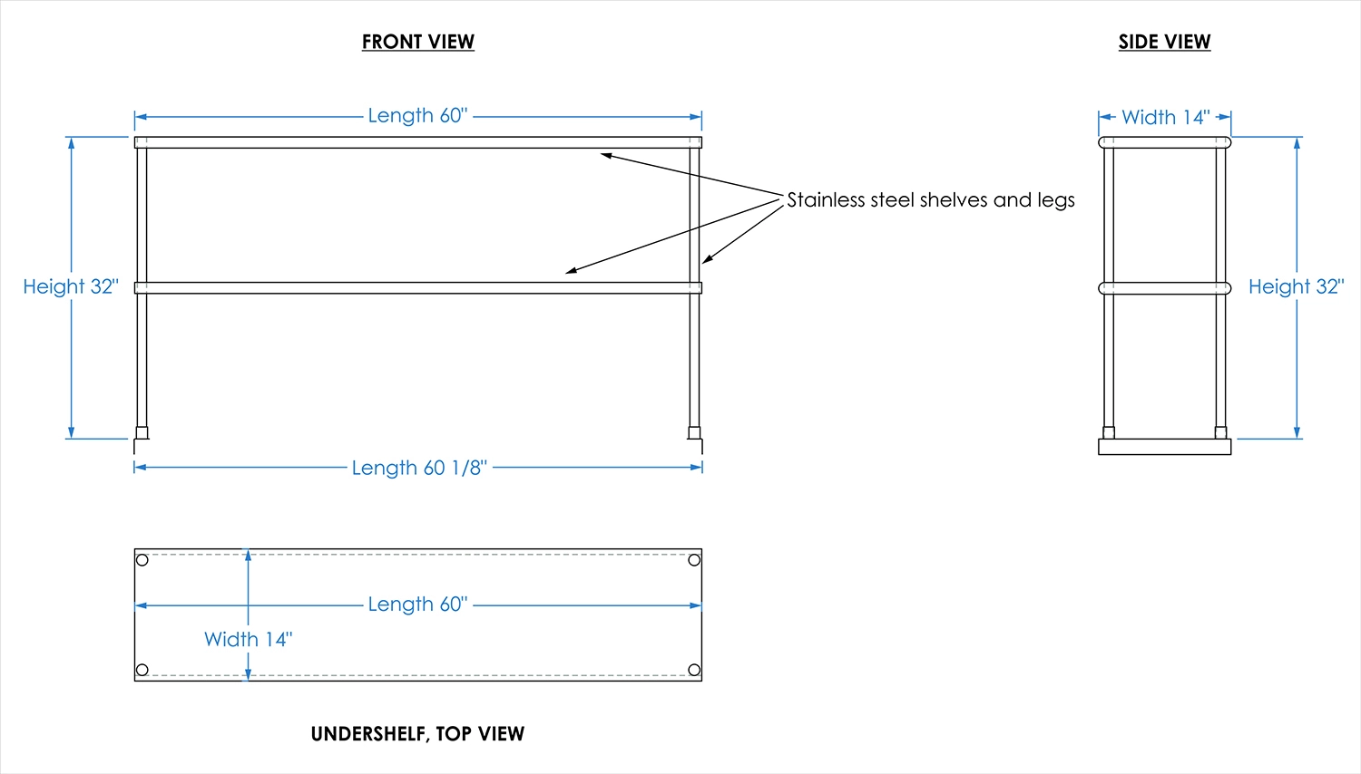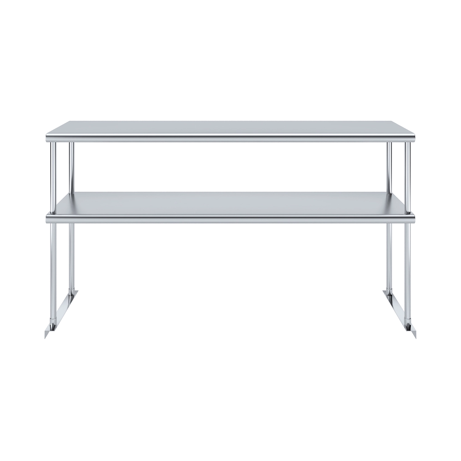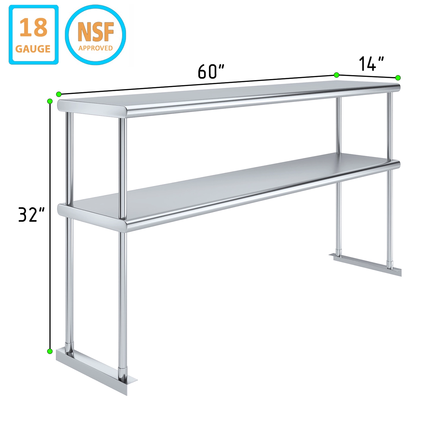 Measuring 14 inches in width and 60 inches in length, this compact yet spacious shelf offers ample storage space across two tiers. The double-tier design maximizes vertical storage capacity, making it ideal for organizing a variety of kitchen essentials, including utensils, ingredients, cookware, and equipment. The open-shelf design allows for easy access and quick retrieval of items, streamlining your workflow and improving productivity.