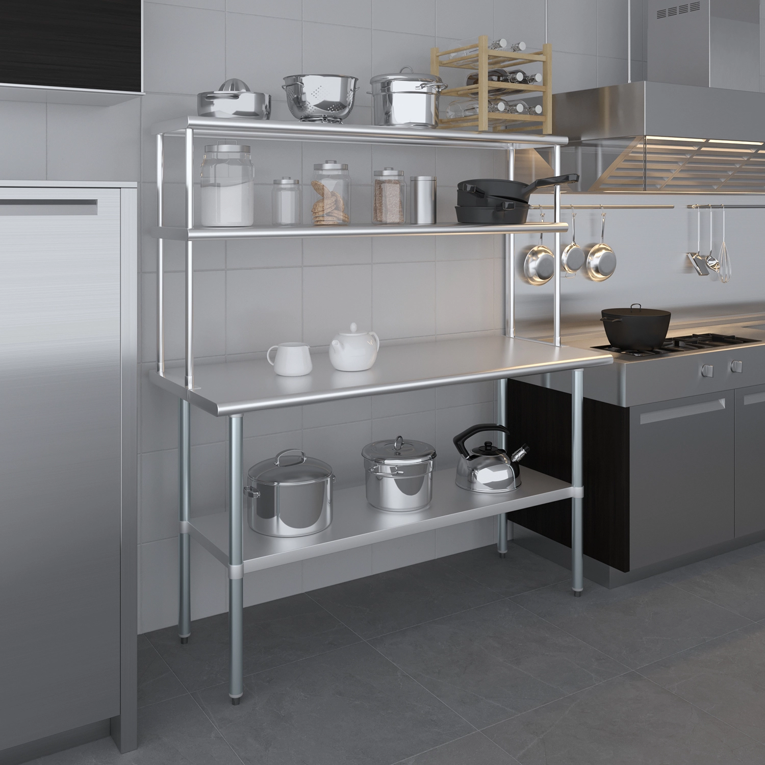 Each shelf is built to support significant weight, thanks to its robust construction, ensuring it can handle heavy-duty use in demanding environments. Whether you need to store bulky pots and pans or delicate ingredients, this shelf provides a reliable and sturdy solution.