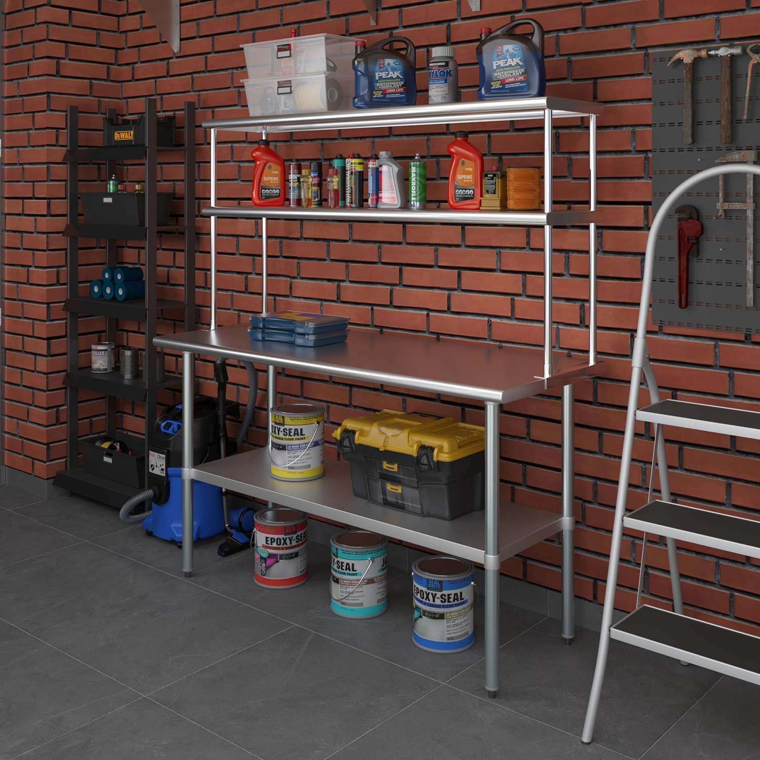 Installation is straightforward, with all necessary mounting hardware included, allowing for quick and easy setup. The versatile design of this double-tier shelf makes it suitable for various applications beyond the kitchen, such as in garages, workshops, or any area where organized storage is essential.