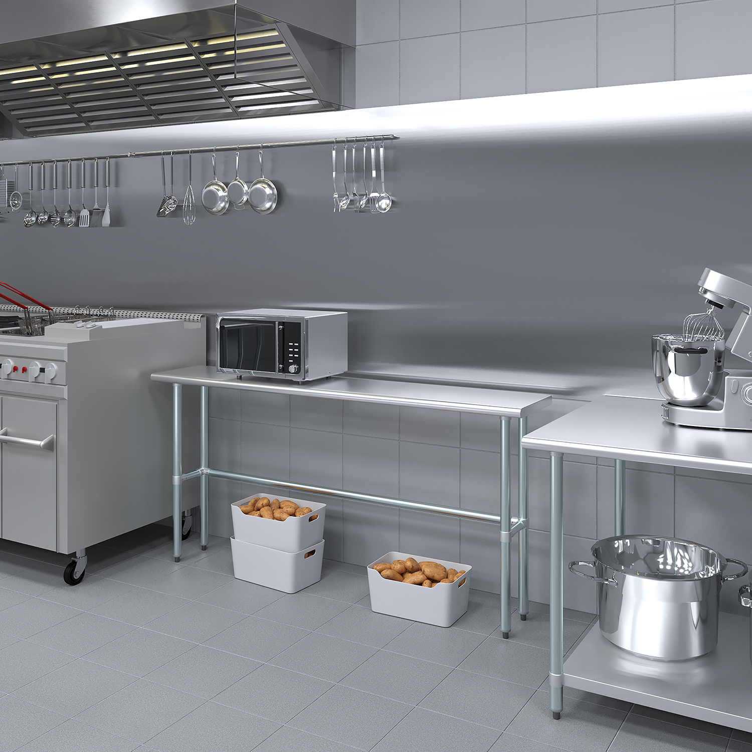 Enhance your workspace with the versatile and durable 14″ x 72″ Stainless Steel Work Table with Open Base. Crafted from 18GA/430 stainless steel, this work table is designed to withstand the rigors of daily use in commercial kitchens, workshops, laboratories, and other demanding environments. Its sleek, smooth surface is not only easy to clean but also resistant, ensuring long-lasting performance and hygiene.