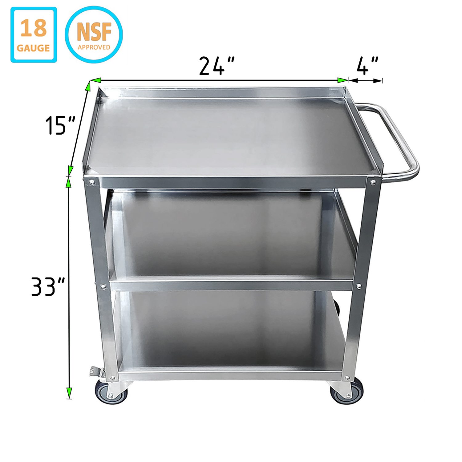 Introducing the 15″ Wide X 24″ Long X 33″ Height Stainless Steel 3 Shelf Utility Cart with Wheels, designed to bring unparalleled convenience and efficiency to your commercial kitchen, restaurant, or catering service. This utility cart is meticulously crafted from 18GA/430 stainless steel, offering superior durability and ensuring long-lasting performance even in the most demanding environments.