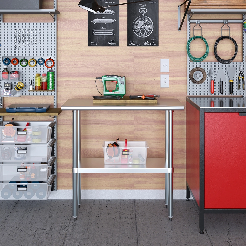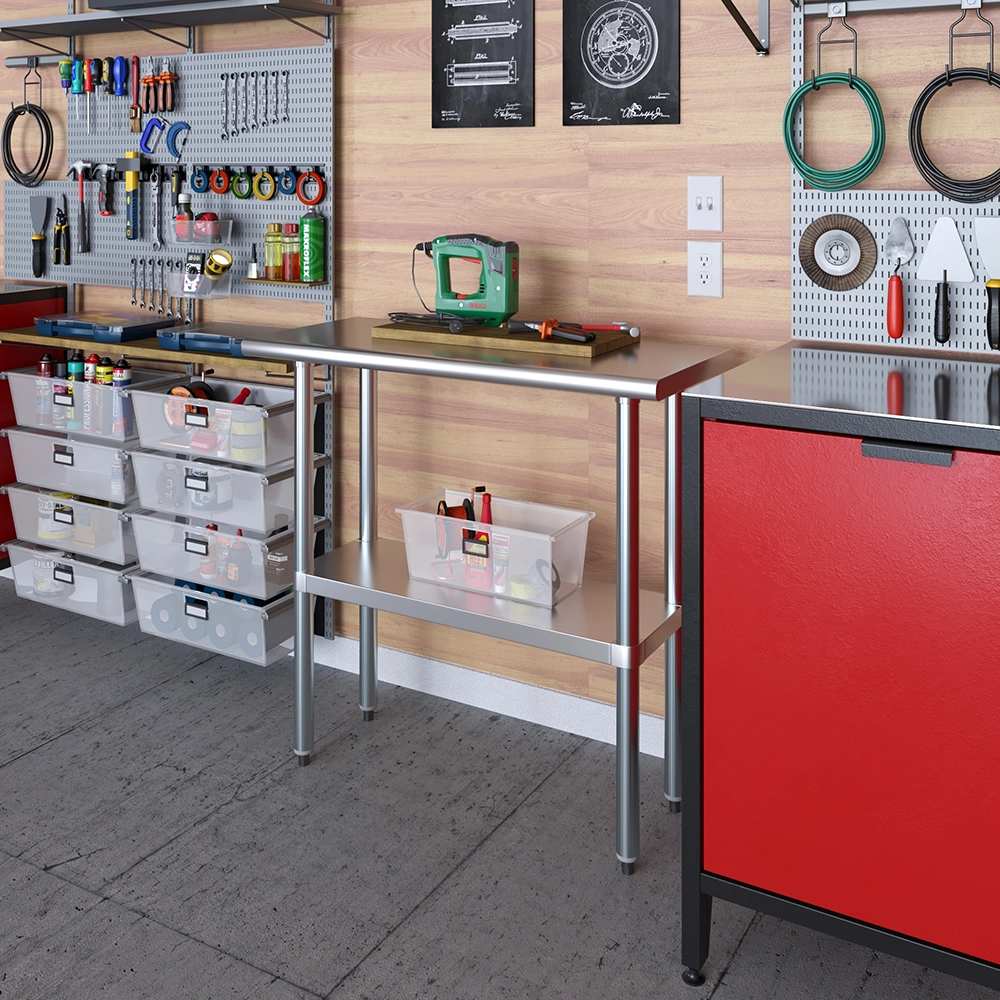 A key feature of this work table is the adjustable undershelf, which offers additional storage space for tools, supplies, and equipment. This undershelf can be positioned at your preferred height, allowing for customized storage solutions that meet your specific needs. Whether you need to store heavy equipment or small utensils, this versatile shelf enhances the functionality of your workspace by keeping essential items within easy reach.