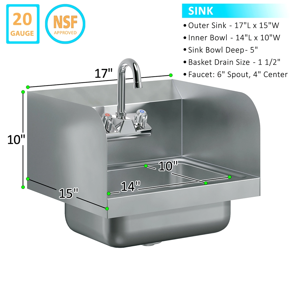 17″ X 15″ Stainless Steel Wall Mount Hand Sink with Gooseneck Faucet and Sidesplash