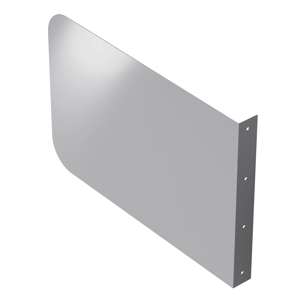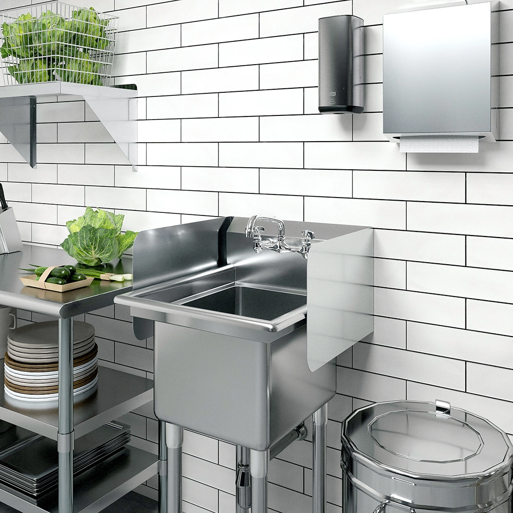 Designed to be mounted directly to the wall next to sinks or workstations, the splash guard serves as a protective barrier that helps prevent water, food particles, and other debris from splashing onto adjacent walls, equipment, or prep surfaces. This not only helps to maintain cleanliness but also supports compliance with health and safety regulations.