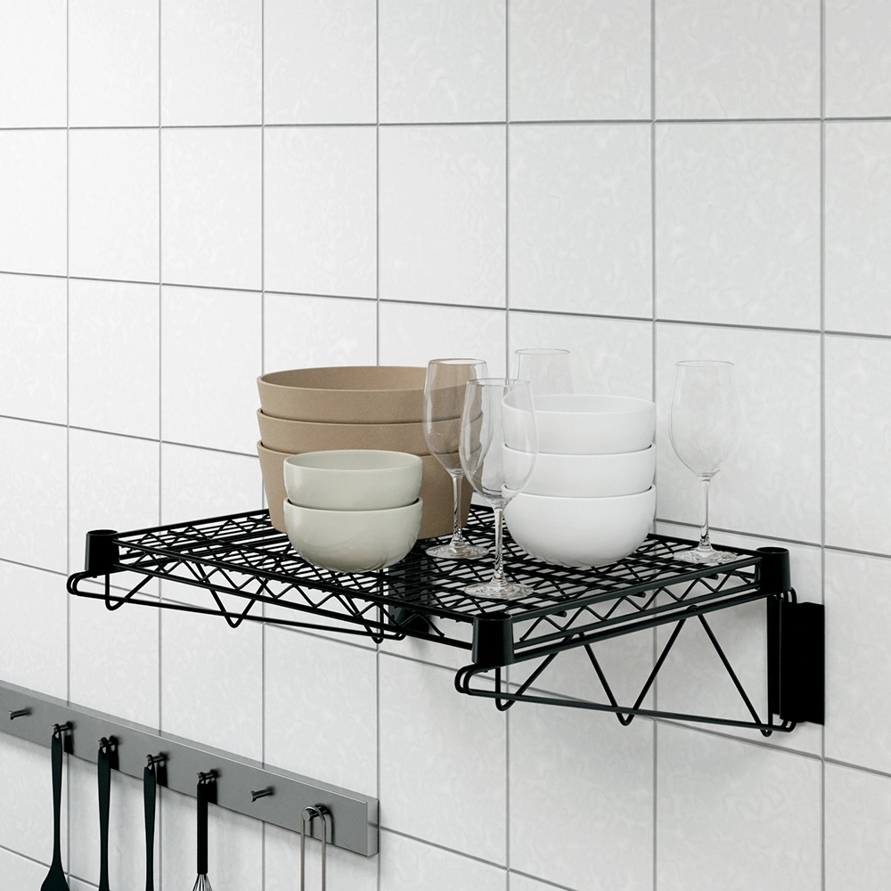 This wall-mounted shelf includes sturdy brackets for secure installation, providing reliable support and stability. It is perfect for storing kitchen essentials, cookware, cleaning supplies, tools, or decorative items. Its sleek black finish adds a modern, professional touch to any space.