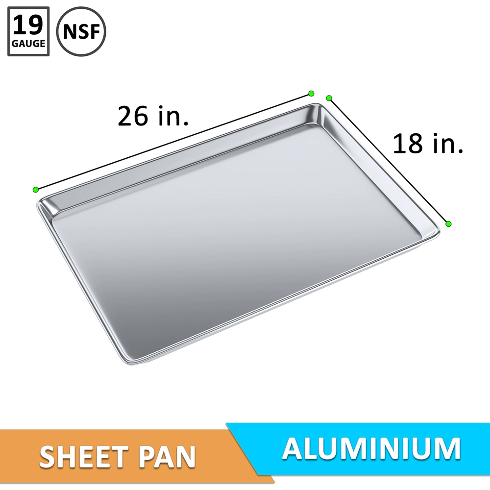 Maximize your commercial baking output with this 18 in. x 26 in. Full Size Aluminum Bun/Sheet Pan (Pack of 12), constructed from durable 19-gauge aluminum for long-lasting performance in busy kitchens. These pans offer excellent heat conductivity, ensuring even baking, browning, and roasting for a wide variety of foods, including breads, pastries, cookies, sheet-pan meals, and appetizers. Lightweight yet sturdy, each pan resists bending and warping under repeated exposure to high oven temperatures, maintaining a flat and reliable surface for consistent results.