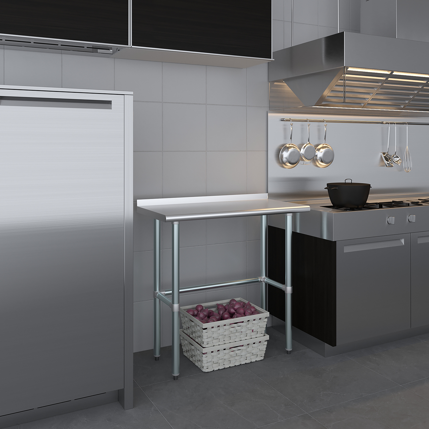 The modern, professional design of the stainless steel work table with open base and backsplash not only enhances functionality but also adds aesthetic value to your workspace. Whether you’re slicing vegetables in a bustling kitchen, conducting research in a lab, or assembling components in a workshop, this work table is a reliable and stylish addition to your environment.