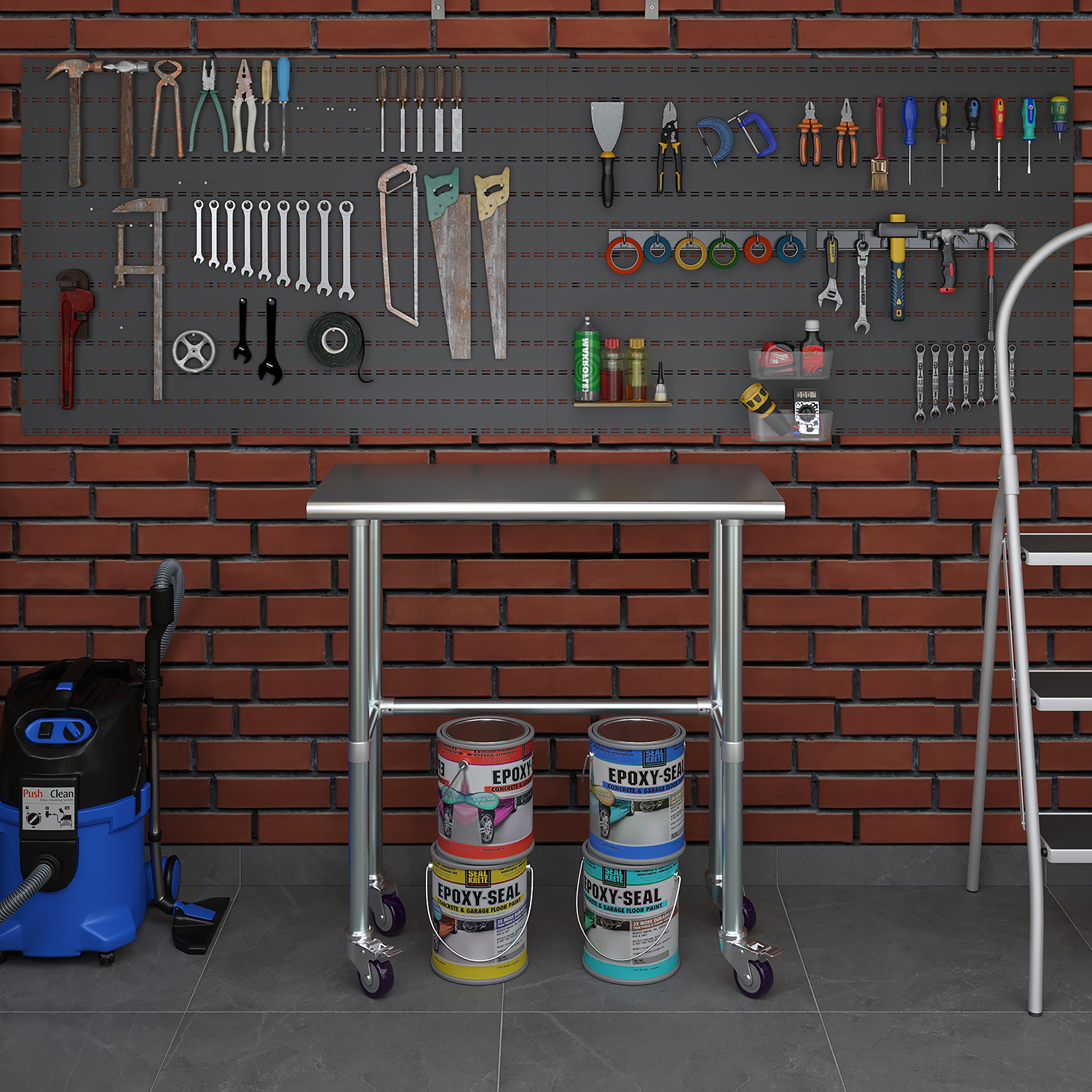 Equipped with a set of four wheels, this work table offers unparalleled mobility. The wheels are designed to glide smoothly across different surfaces, allowing you to reposition the table effortlessly as needed. This mobility is particularly beneficial in dynamic environments where flexibility and adaptability are crucial. Additionally, the wheels are equipped with locking mechanisms to ensure stability and prevent unwanted movement during use.