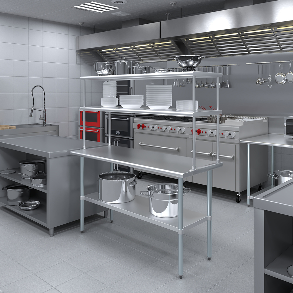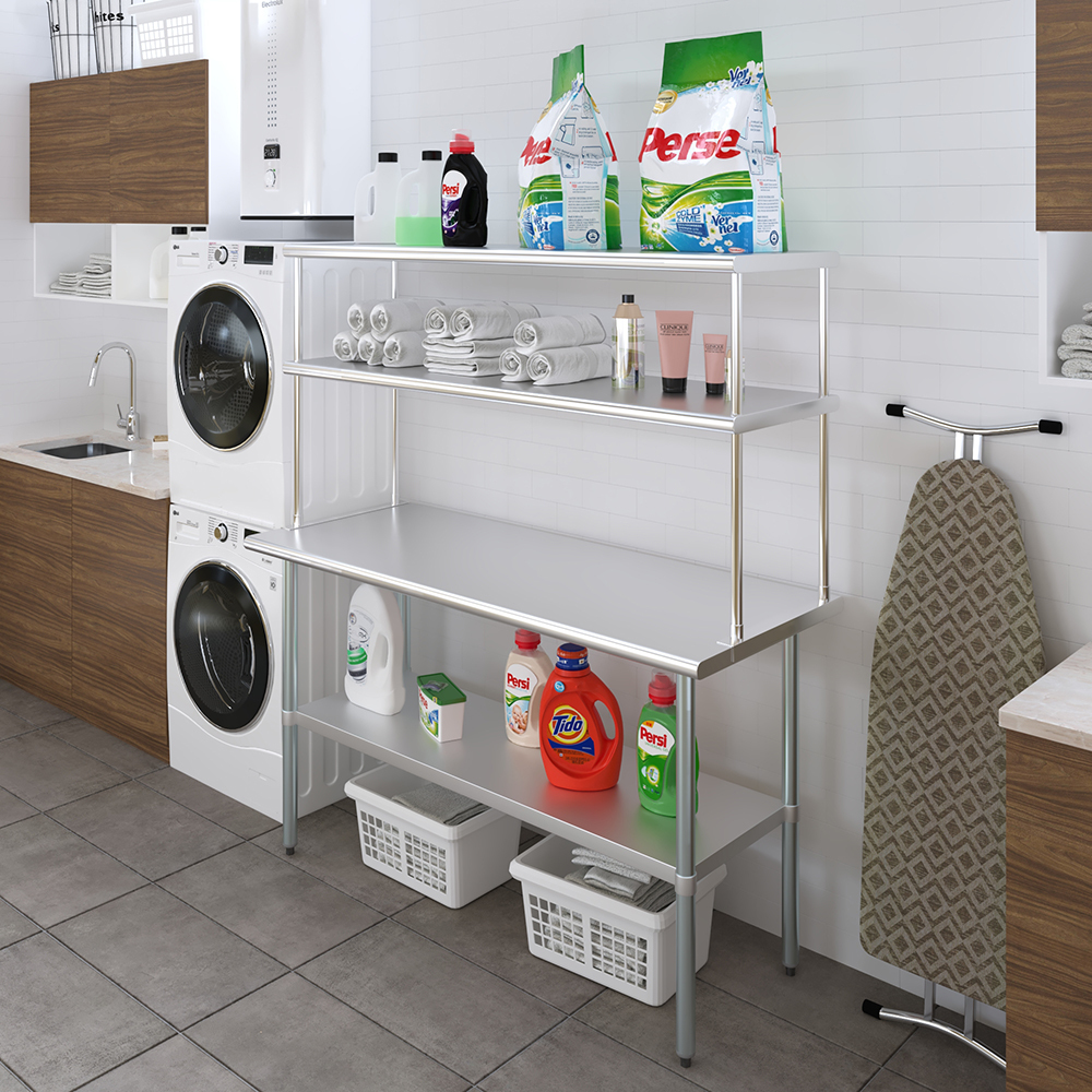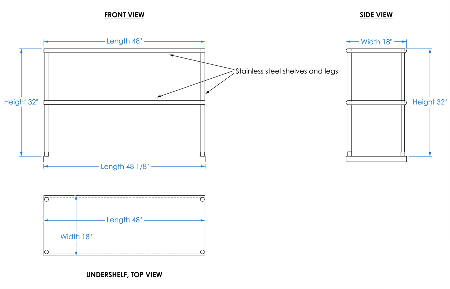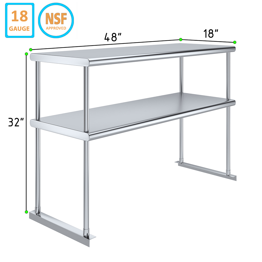 Measuring 18 inches in width and 48 inches in length, this compact yet spacious shelf offers ample storage space across two tiers. The double-tier design maximizes vertical storage capacity, making it ideal for organizing a variety of kitchen essentials, including utensils, ingredients, cookware, and equipment. The open-shelf design allows for easy access and quick retrieval of items, streamlining your workflow and improving productivity.