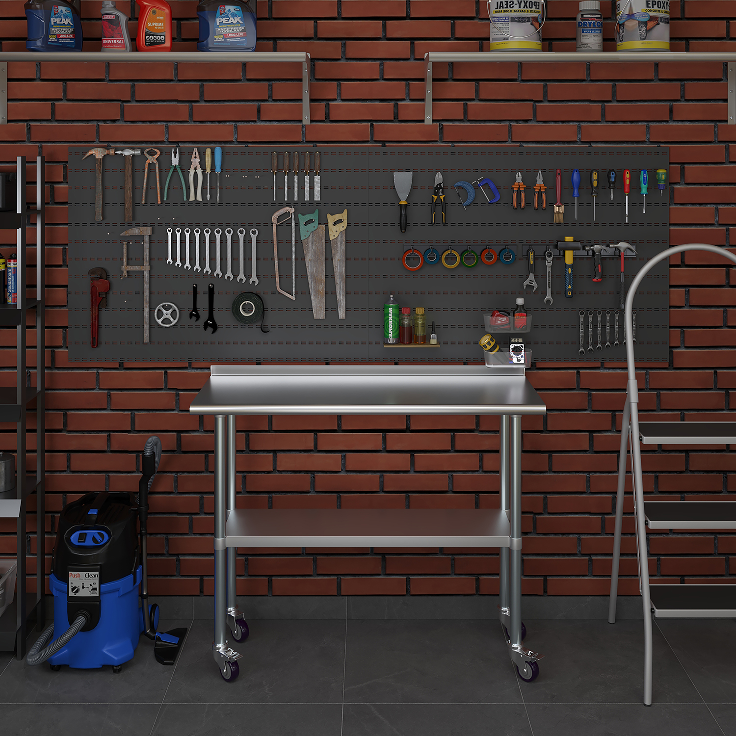 Upgrade your workspace with this versatile and practical work table that combines high functionality with contemporary design. Perfect for enhancing productivity and organization, the 18″ x 48″ Stainless Steel Work Table with 1.5″ Backsplash and Wheels is an essential asset for any professional setting, providing durability, convenience, and efficiency in a compact, mobile unit.
