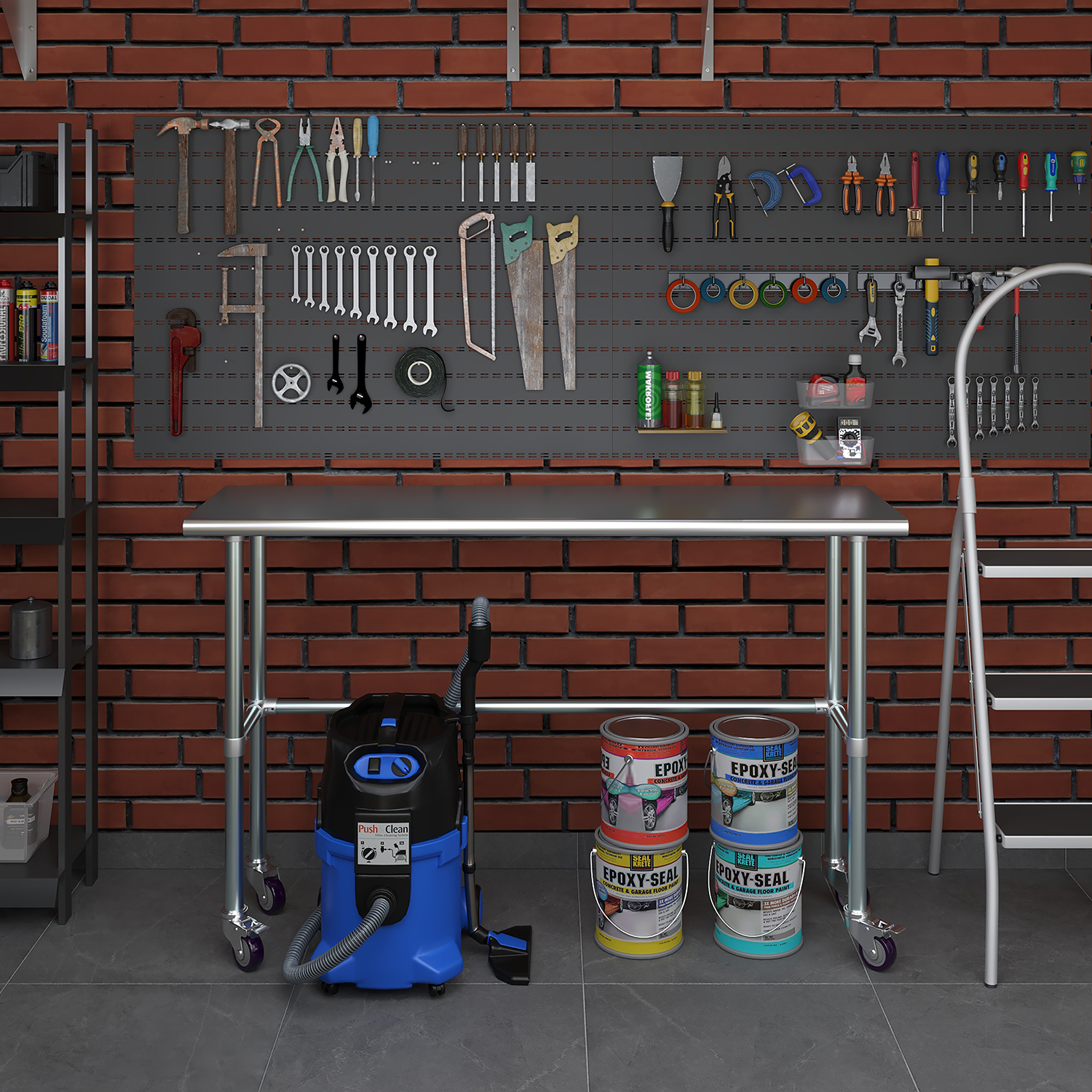 Equipped with a set of four wheels, this work table offers unparalleled mobility. The wheels are designed to glide smoothly across different surfaces, allowing you to reposition the table effortlessly as needed. This mobility is particularly beneficial in dynamic environments where flexibility and adaptability are crucial. Additionally, the wheels are equipped with locking mechanisms to ensure stability and prevent unwanted movement during use.