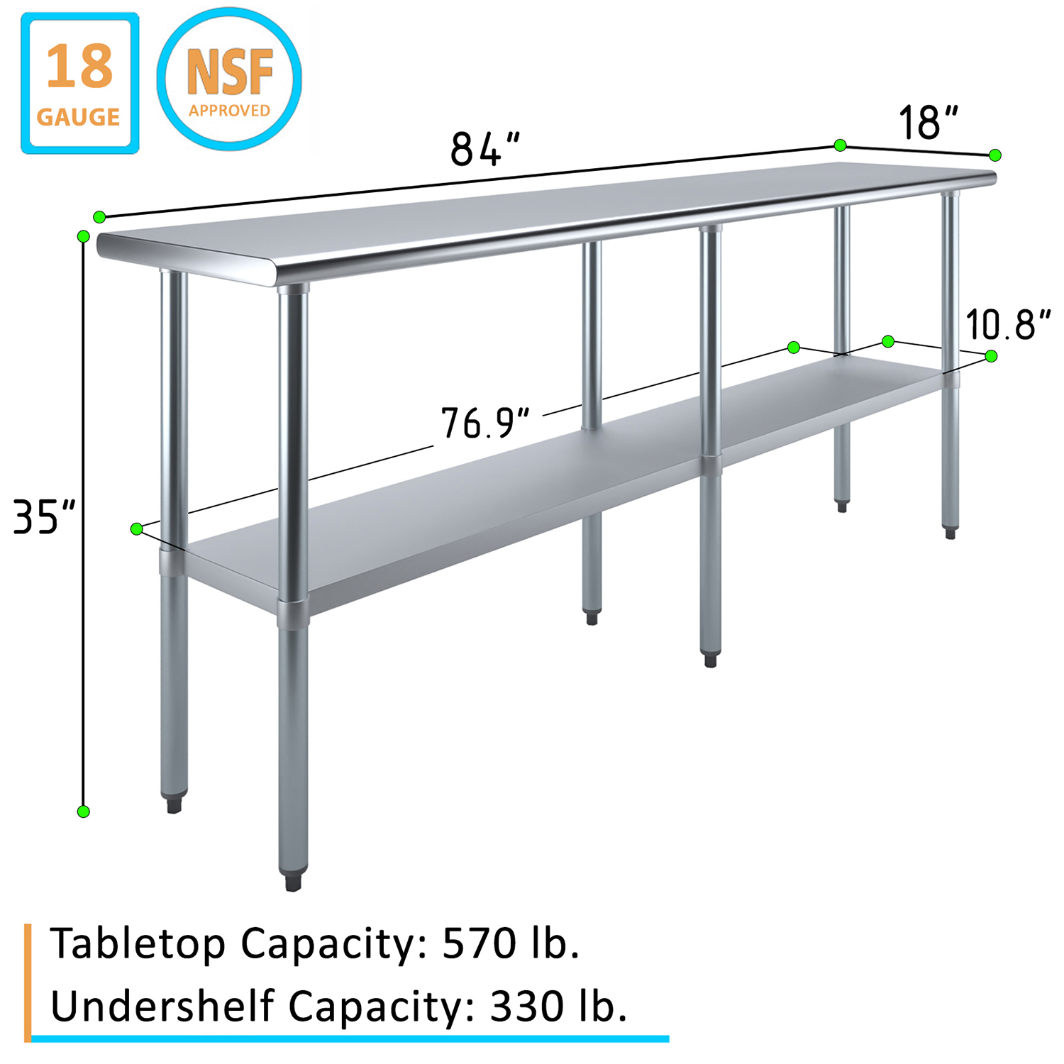 The spacious 18″ x 84″ tabletop provides ample workspace for a variety of tasks, including food preparation, equipment handling, and general workspace organization. Its smooth, polished surface is easy to clean and maintain, ensuring a hygienic environment that meets the high standards of any commercial setting.