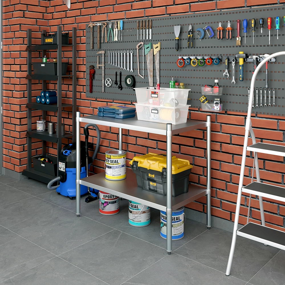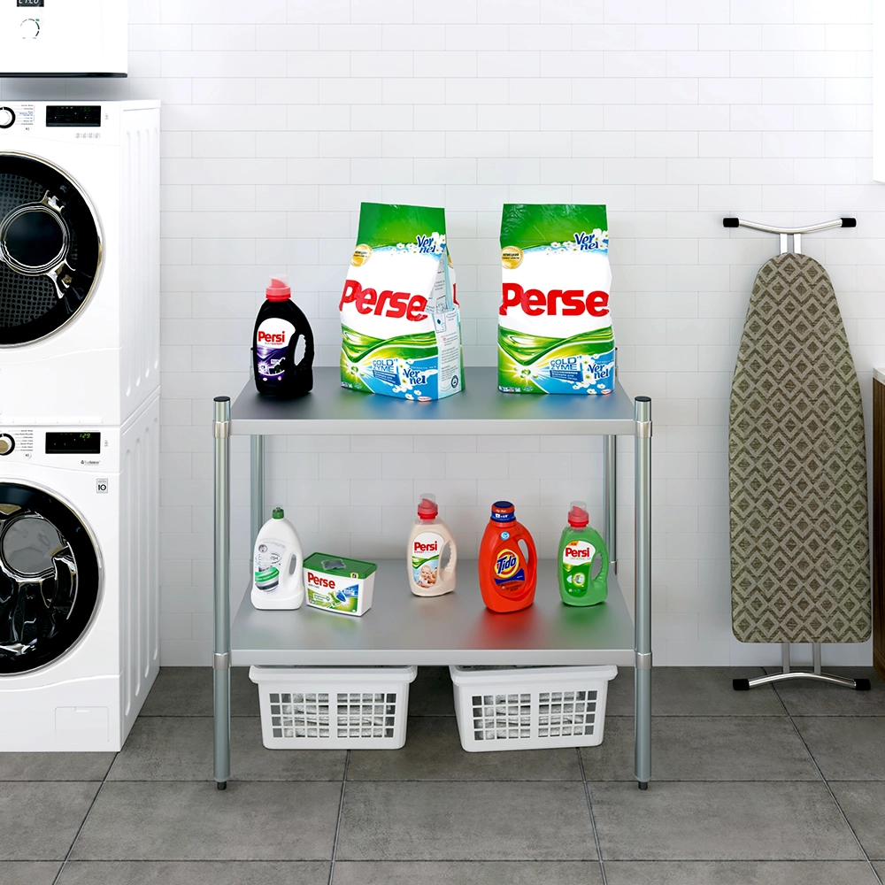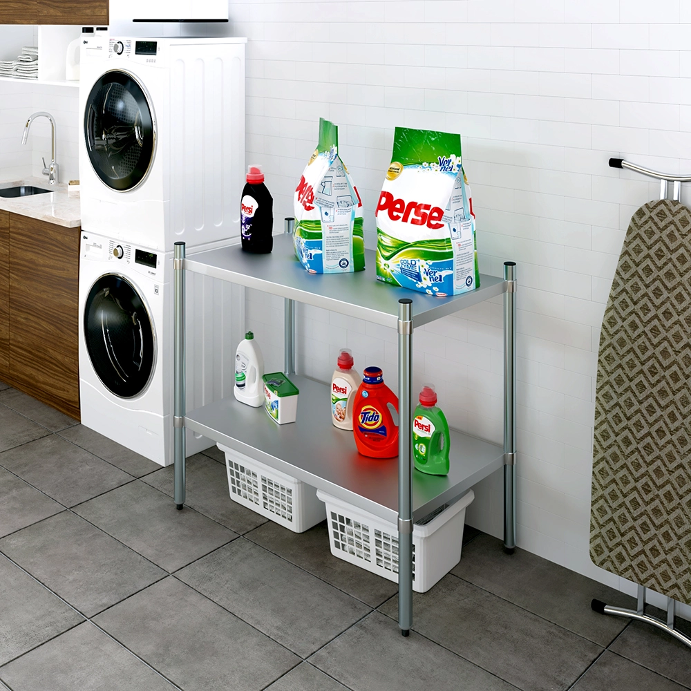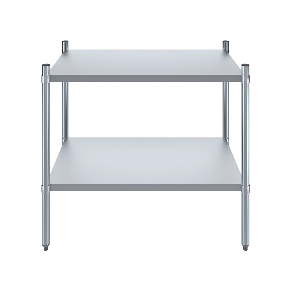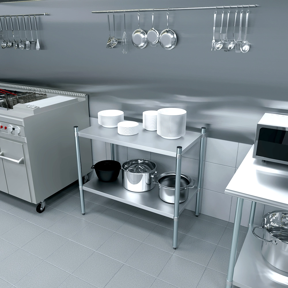 The two-tier design provides ample space for organizing bulk ingredients, kitchen supplies, or cleaning equipment while helping maintain proper airflow and keeping items off the ground—an important feature for meeting food safety and sanitation standards. Each shelf is designed to support heavy loads and is easy to clean, ensuring long-term usability and minimal maintenance.