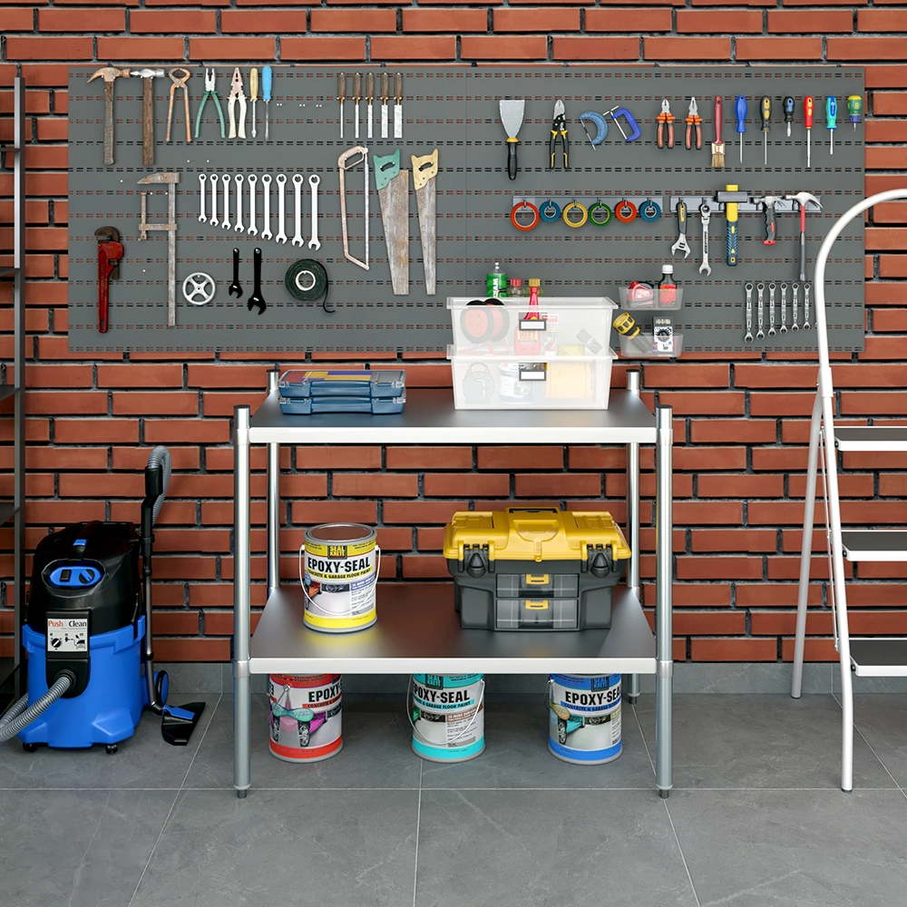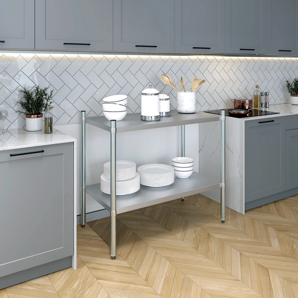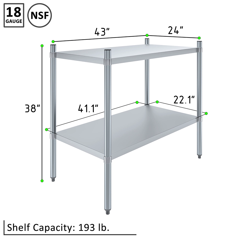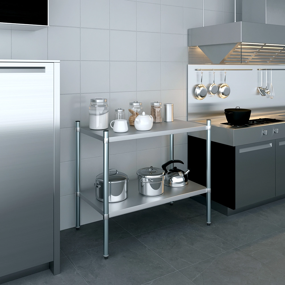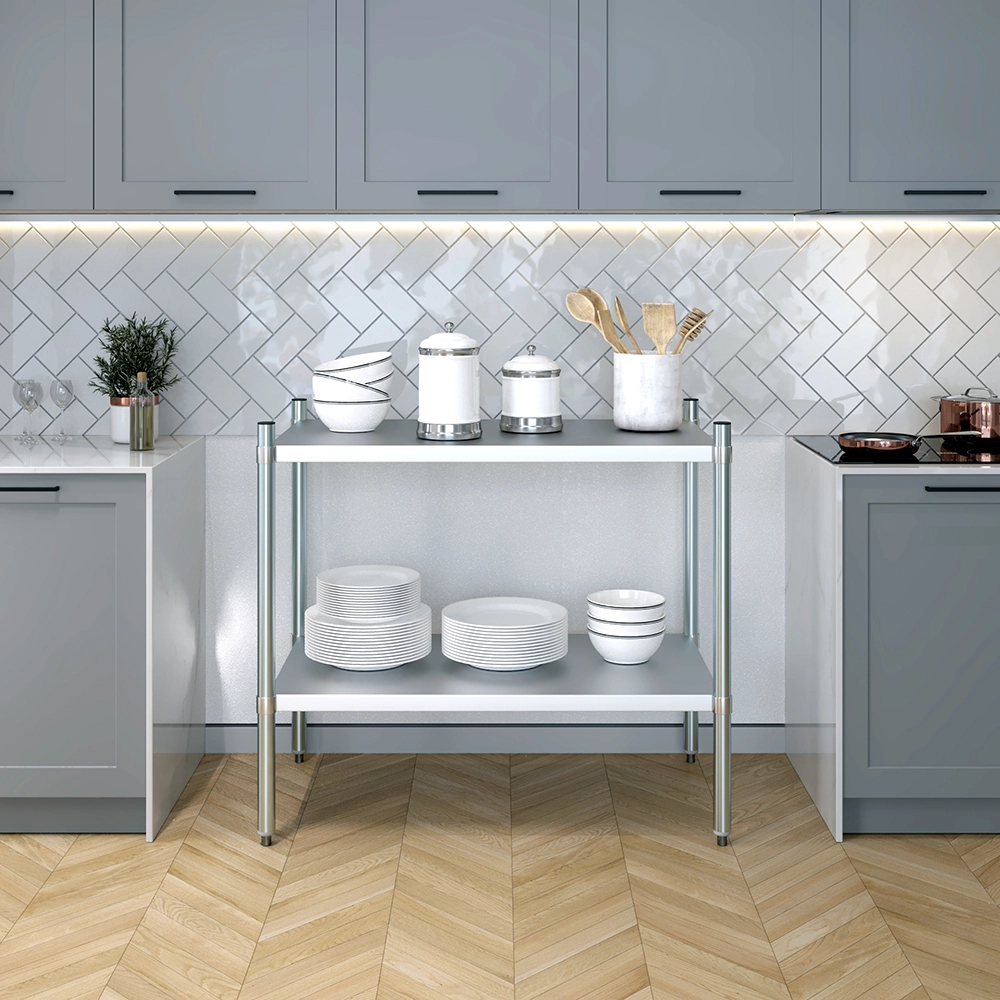 The two-tier design provides ample space for organizing bulk ingredients, kitchen supplies, or cleaning equipment while helping maintain proper airflow and keeping items off the ground—an important feature for meeting food safety and sanitation standards. Each shelf is designed to support heavy loads and is easy to clean, ensuring long-term usability and minimal maintenance.