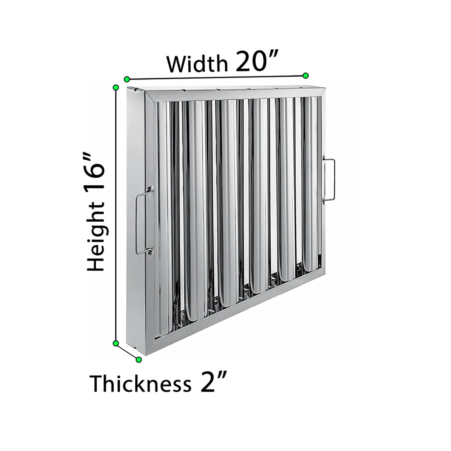 Enhance your kitchen ventilation system with our 20″ Width X 16″ Height X 2″ Thickness Stainless Steel Hood Filter, available in a convenient pack of 2. These filters are crafted from 430 stainless steel, offering exceptional durability and long-lasting performance. Designed to effectively trap grease, smoke, and particulates, these filters ensure a cleaner, safer, and more hygienic kitchen environment.