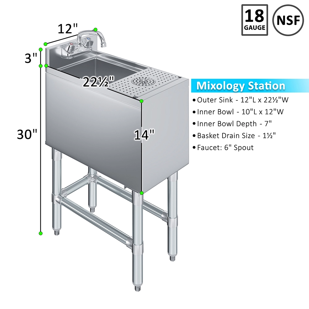 The 22 in. x 12 in. Mixology Station is a compact, all-in-one underbar unit designed to optimize workflow and maximize functionality in busy bar environments. Built from 18GA/304 stainless steel, it offers exceptional durability, corrosion resistance, and easy maintenance, making it ideal for commercial use in bars, restaurants, and beverage service areas.