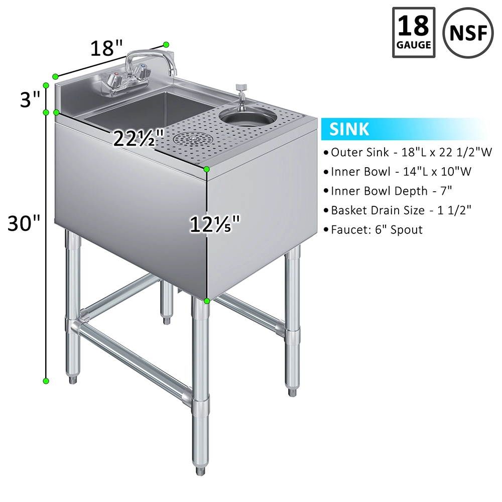 The 22 in. x 18 in. Mixology Station is a compact, all-in-one underbar unit designed to optimize workflow and maximize functionality in busy bar environments. Built from 18GA/304 stainless steel, it offers exceptional durability, corrosion resistance, and easy maintenance, making it ideal for commercial use in bars, restaurants, and beverage service areas.