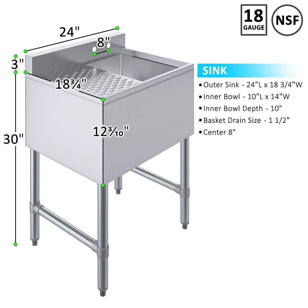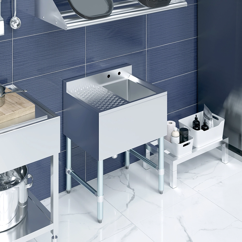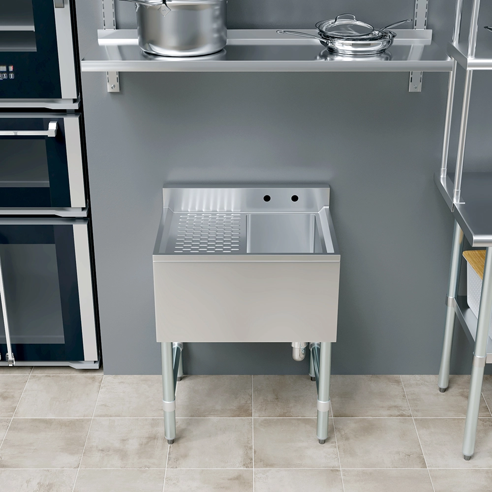 The 24 in. x 19 in. One Compartment Underbar Sink with Left Drainboard is a space-saving and highly functional solution ideal for commercial bars, restaurants, cafés, and beverage service areas. Constructed from durable, 18GA/304 stainless steel, this sink is designed to withstand the demands of busy, high-traffic environments while maintaining a clean, professional appearance.