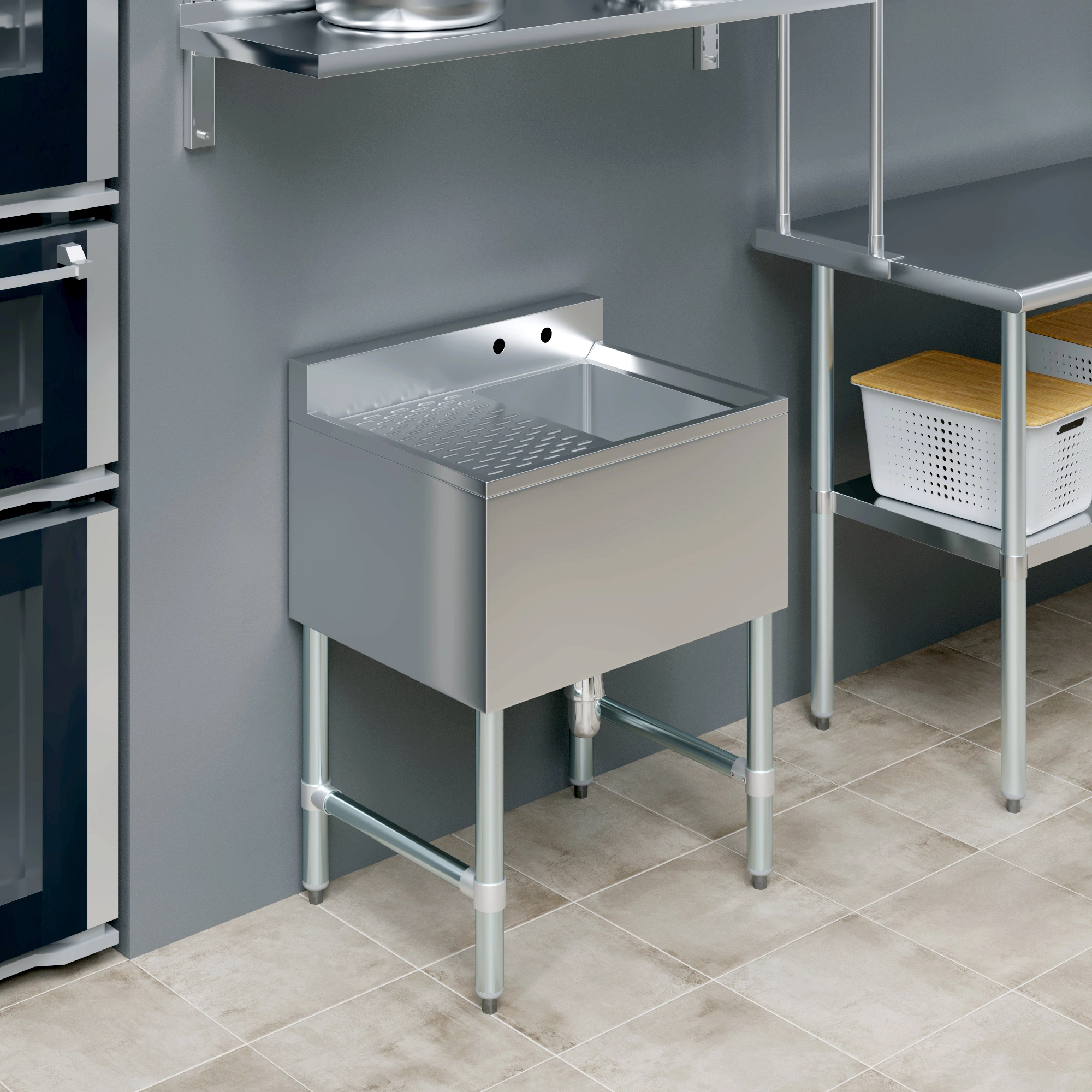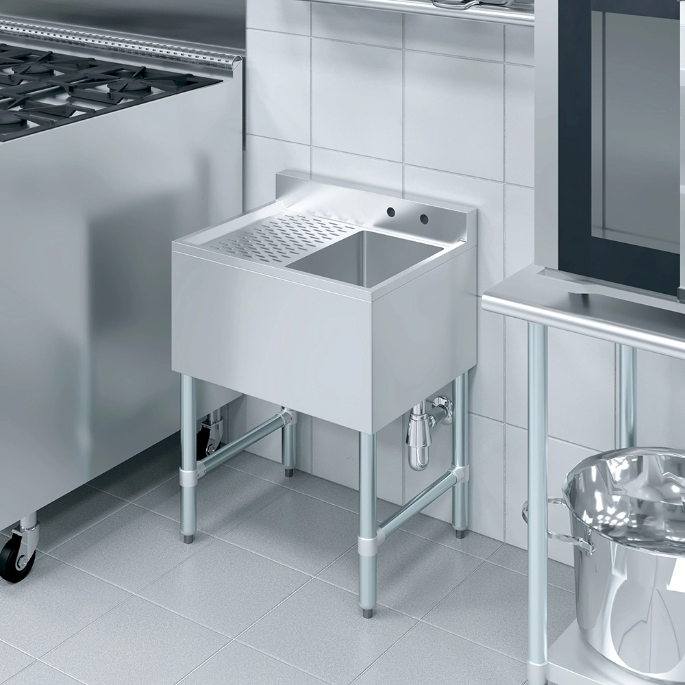 The single compartment is perfect for quick rinsing, washing glassware, or handling small prep tasks. Its deep bowl accommodates a variety of items, enhancing efficiency during peak service times. The integrated left-side drainboard offers additional workspace for air-drying, staging clean items, or managing excess water runoff—helping to maintain a sanitary and organized workflow.