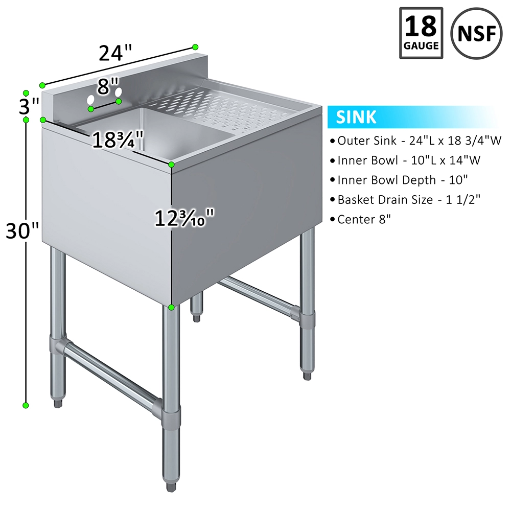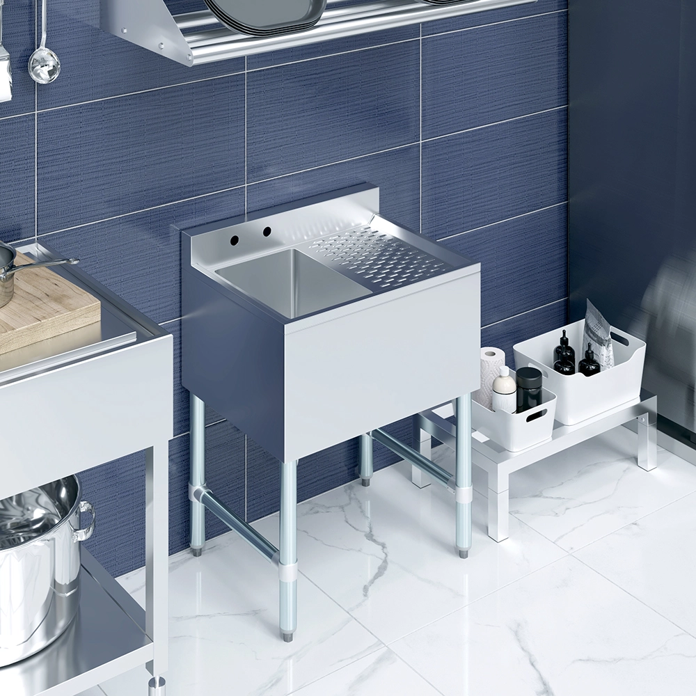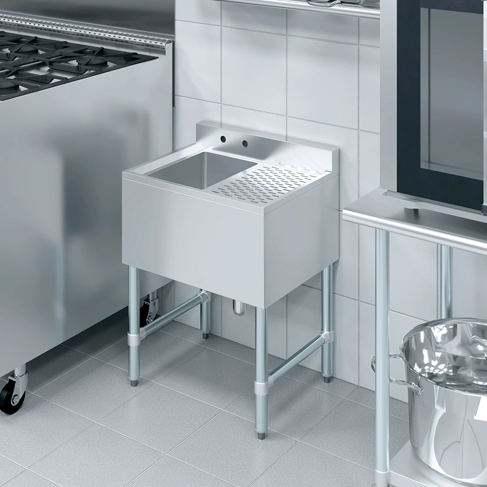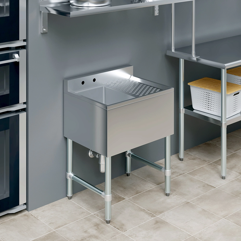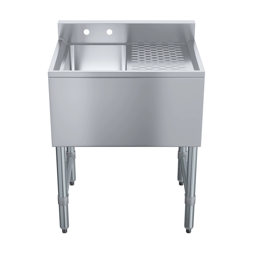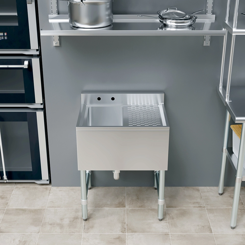The 24 in. x 19 in. One Compartment Underbar Sink with Right Drainboard is a compact, efficient, and durable solution designed for commercial bars, restaurants, and tight kitchen spaces. Constructed from 18GA/304 stainless steel, this underbar sink offers excellent durability, and easy maintenance, ensuring long-lasting performance in demanding food and beverage environments.