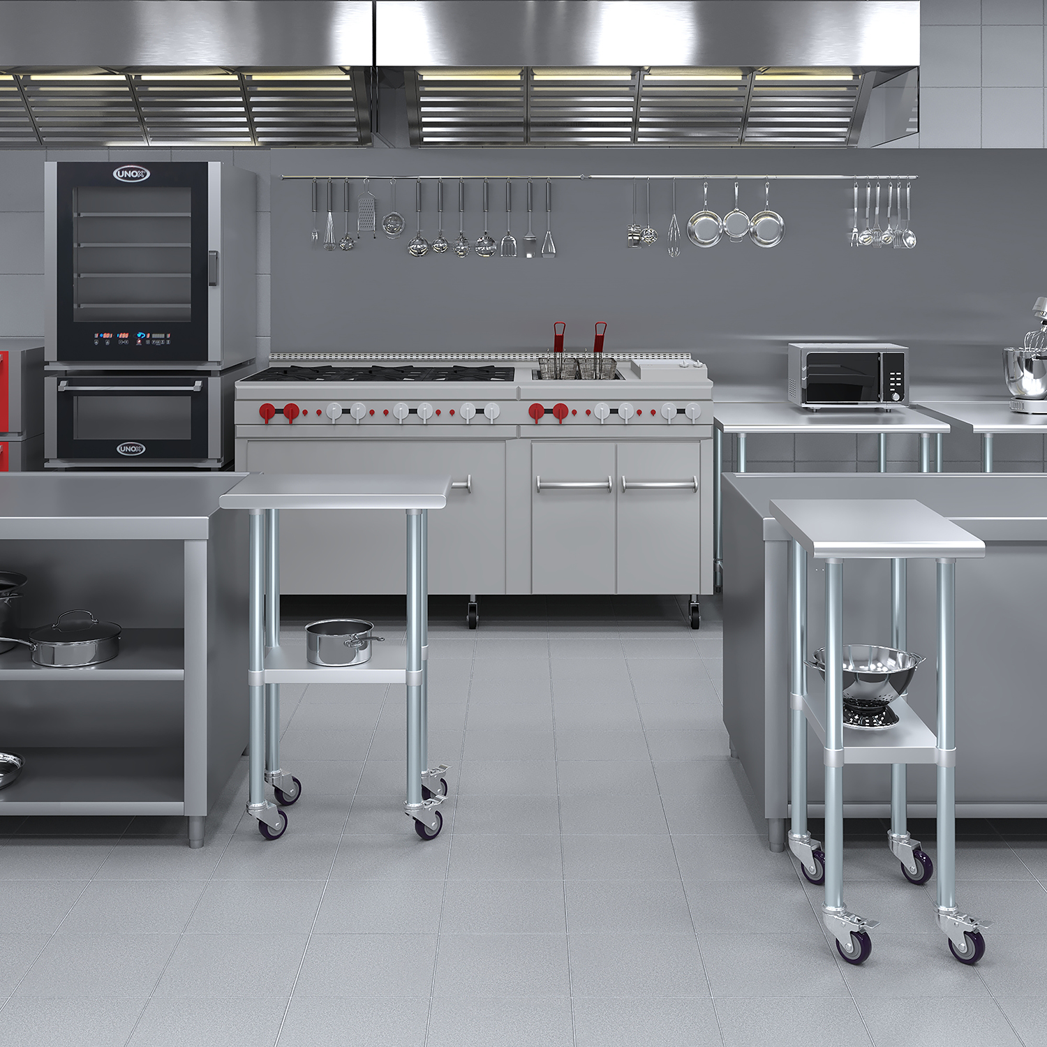 Optimize your workspace with the 24″ x 15″ Stainless Steel Work Table featuring an undershelf and a set of four wheels for enhanced mobility and storage. This work table is constructed from 18GA/430 stainless steel, ensuring a durable, easy-to-clean surface. Designed for demanding environments such as commercial kitchens, laboratories, and workshops, this table guarantees long-lasting performance and reliability.