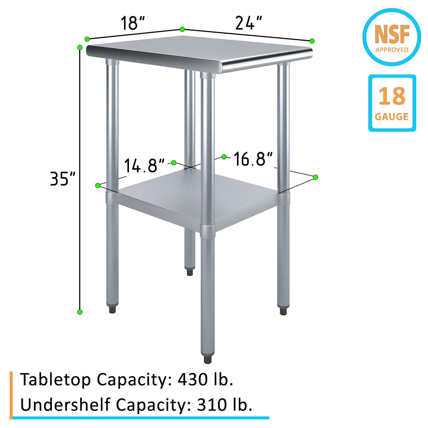 The spacious 24″ x 18″ tabletop provides ample workspace for a variety of tasks, including food preparation, equipment handling, and general workspace organization. Its smooth, polished surface is easy to clean and maintain, ensuring a hygienic environment that meets the high standards of any commercial setting.