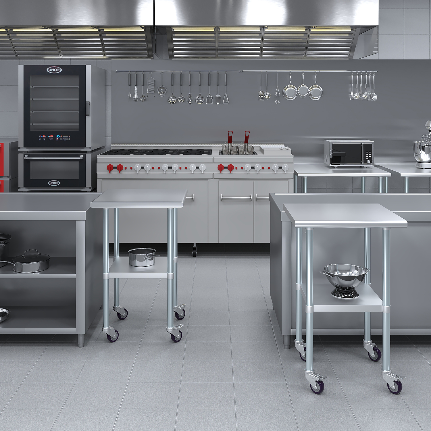 Optimize your workspace with the 24″ x 24″ Stainless Steel Work Table featuring an undershelf and a set of four wheels for enhanced mobility and storage. This work table is constructed from 18GA/430 stainless steel, ensuring a durable, easy-to-clean surface. Designed for demanding environments such as commercial kitchens, laboratories, and workshops, this table guarantees long-lasting performance and reliability.