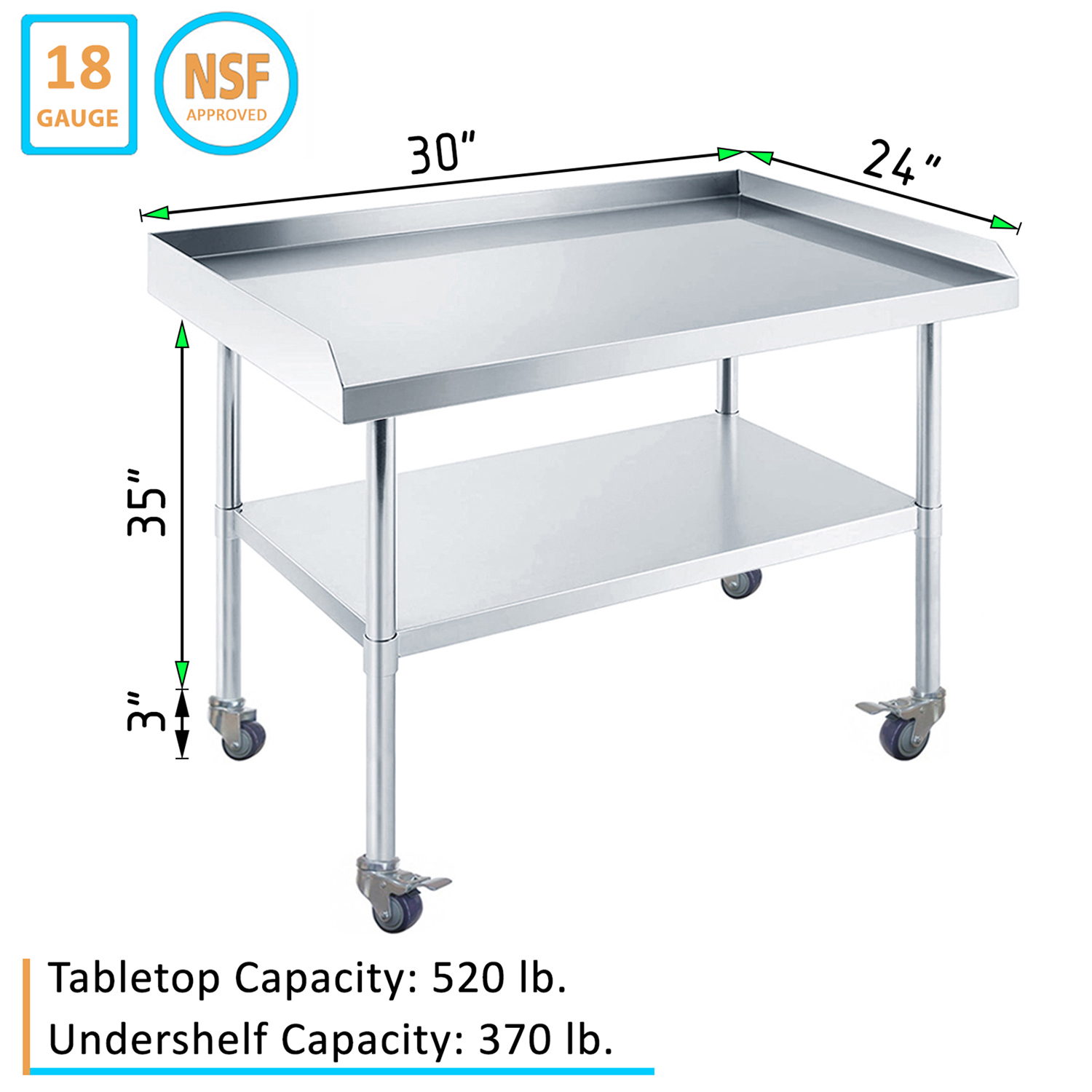 Enhance your kitchen’s efficiency and mobility with our 24″ x 30″ Stainless Steel Equipment Stand, designed with a set of four robust wheels for effortless movement. Constructed from 18GA/430 stainless steel, making it ideal for heavy-duty kitchen equipment such as mixers, slicers, and grinders. The durable construction ensures longevity and stability, while the sleek, polished finish adds a professional touch to any culinary workspace.