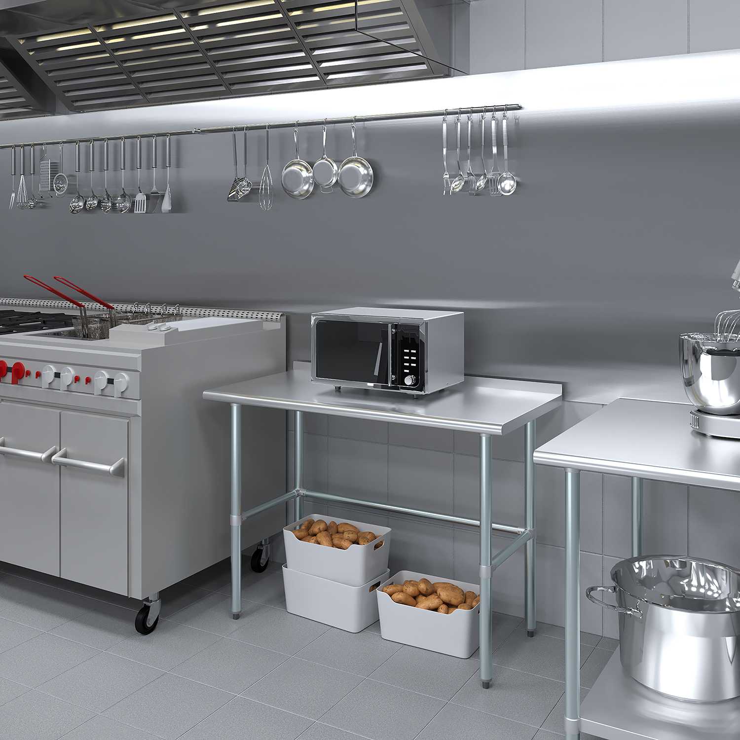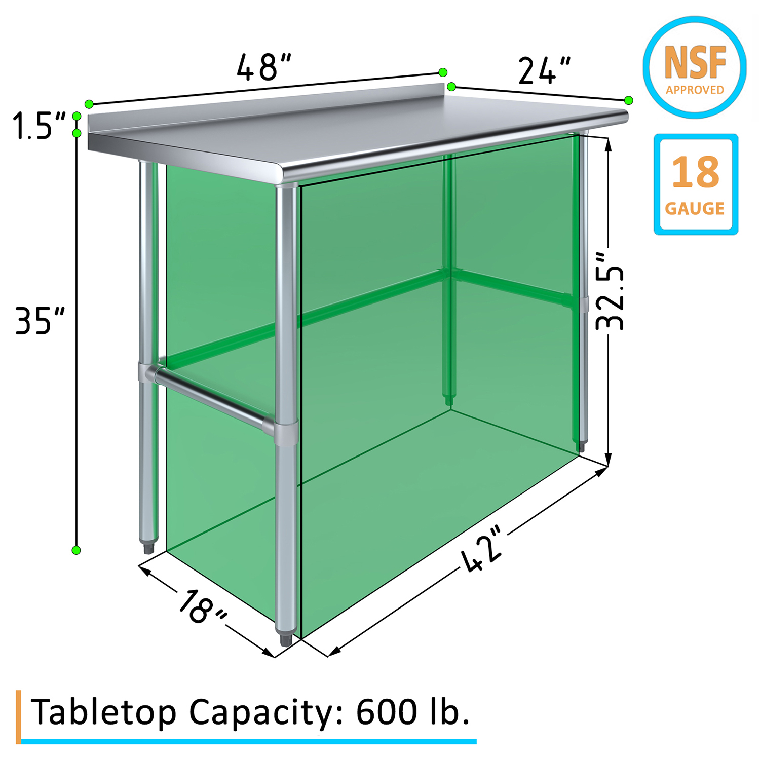 The 1.5″ backsplash is designed to contain spills and splashes, protecting your walls and maintaining a clean and sanitary work area. This feature is especially useful in food preparation settings, where hygiene is paramount. The sleek, smooth surface of the table allows for effortless cleaning, helping you maintain high standards of cleanliness with minimal effort.