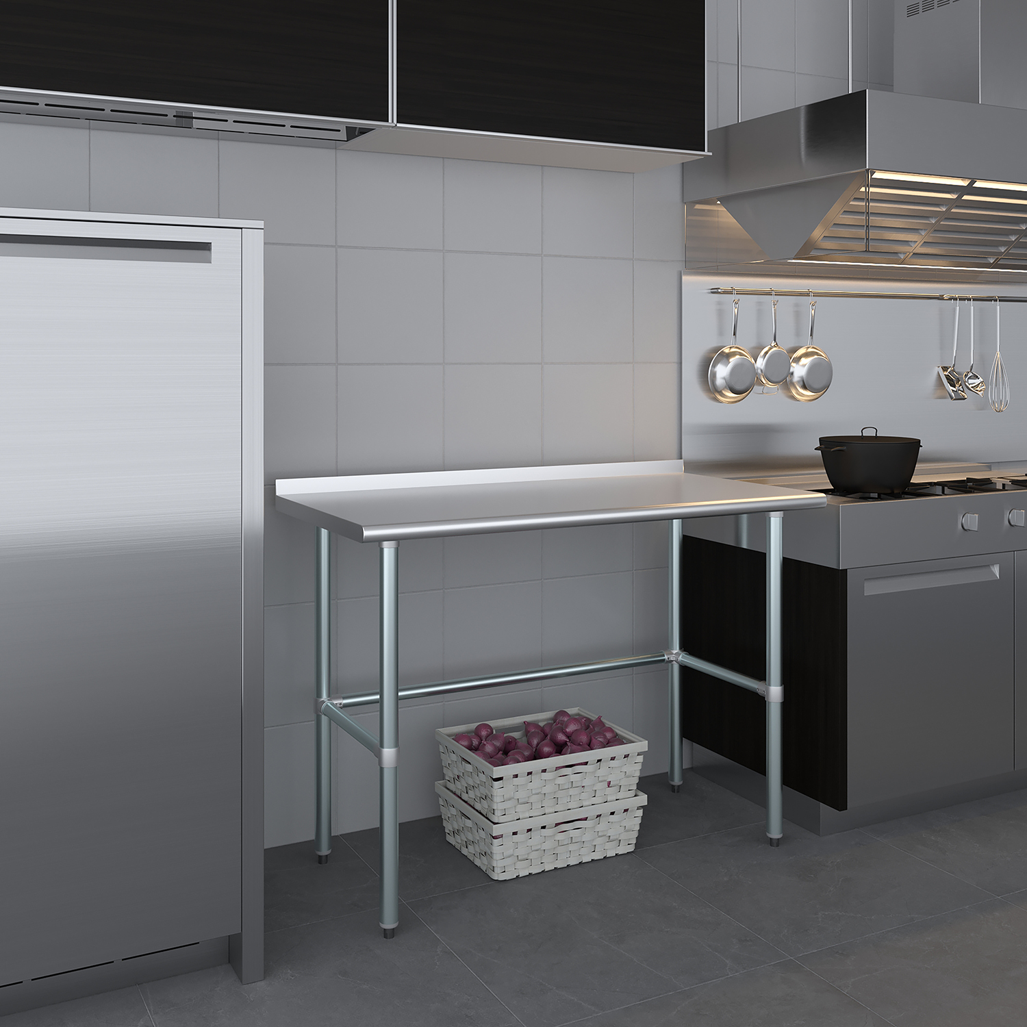The modern, professional design of the stainless steel work table with open base and backsplash not only enhances functionality but also adds aesthetic value to your workspace. Whether you’re slicing vegetables in a bustling kitchen, conducting research in a lab, or assembling components in a workshop, this work table is a reliable and stylish addition to your environment.