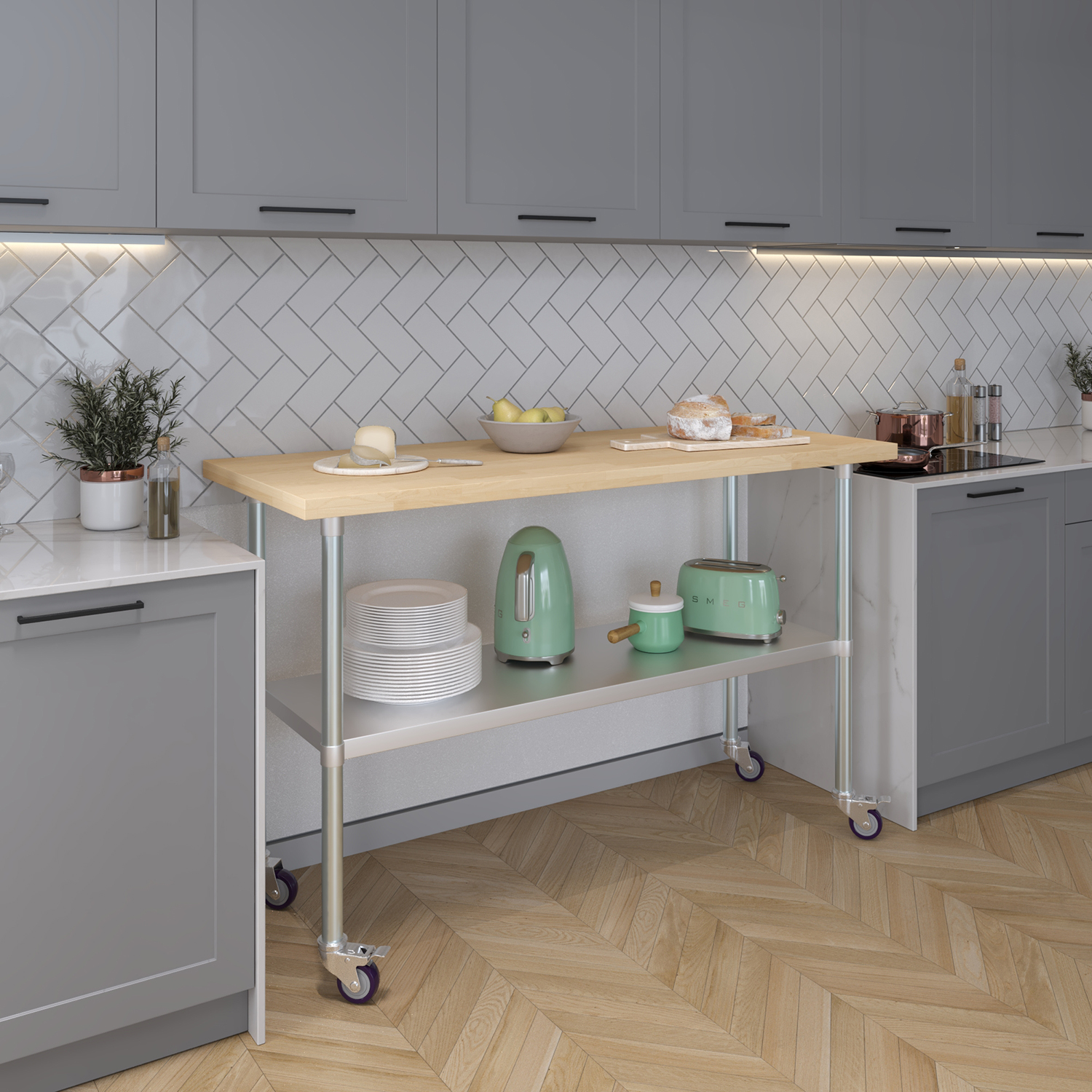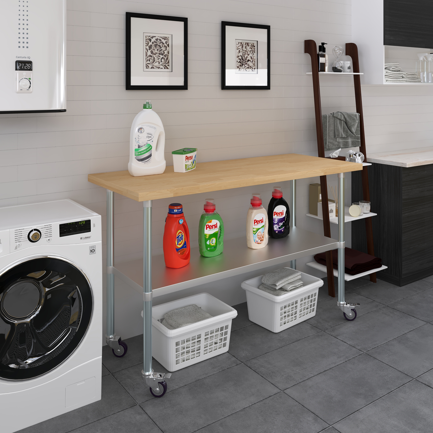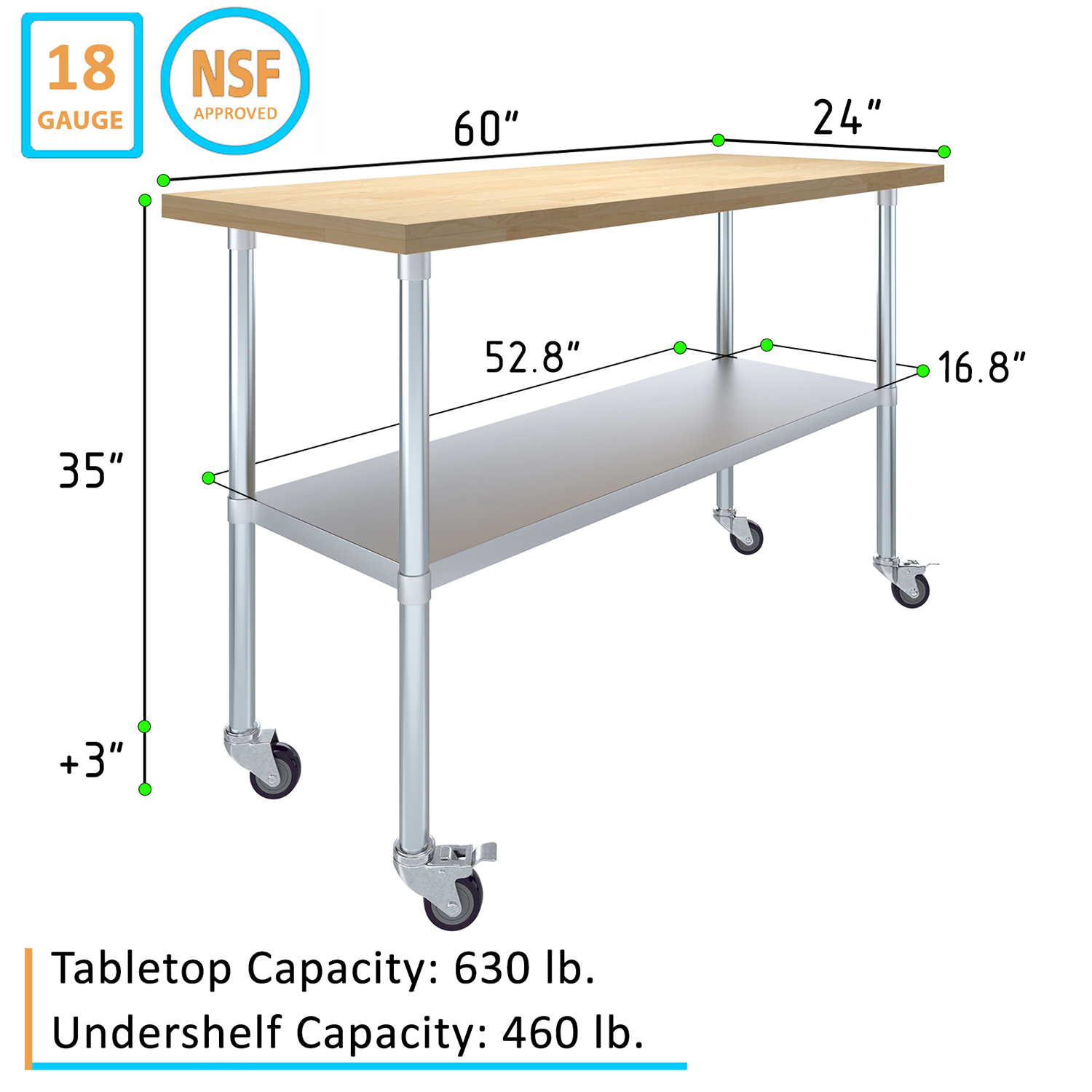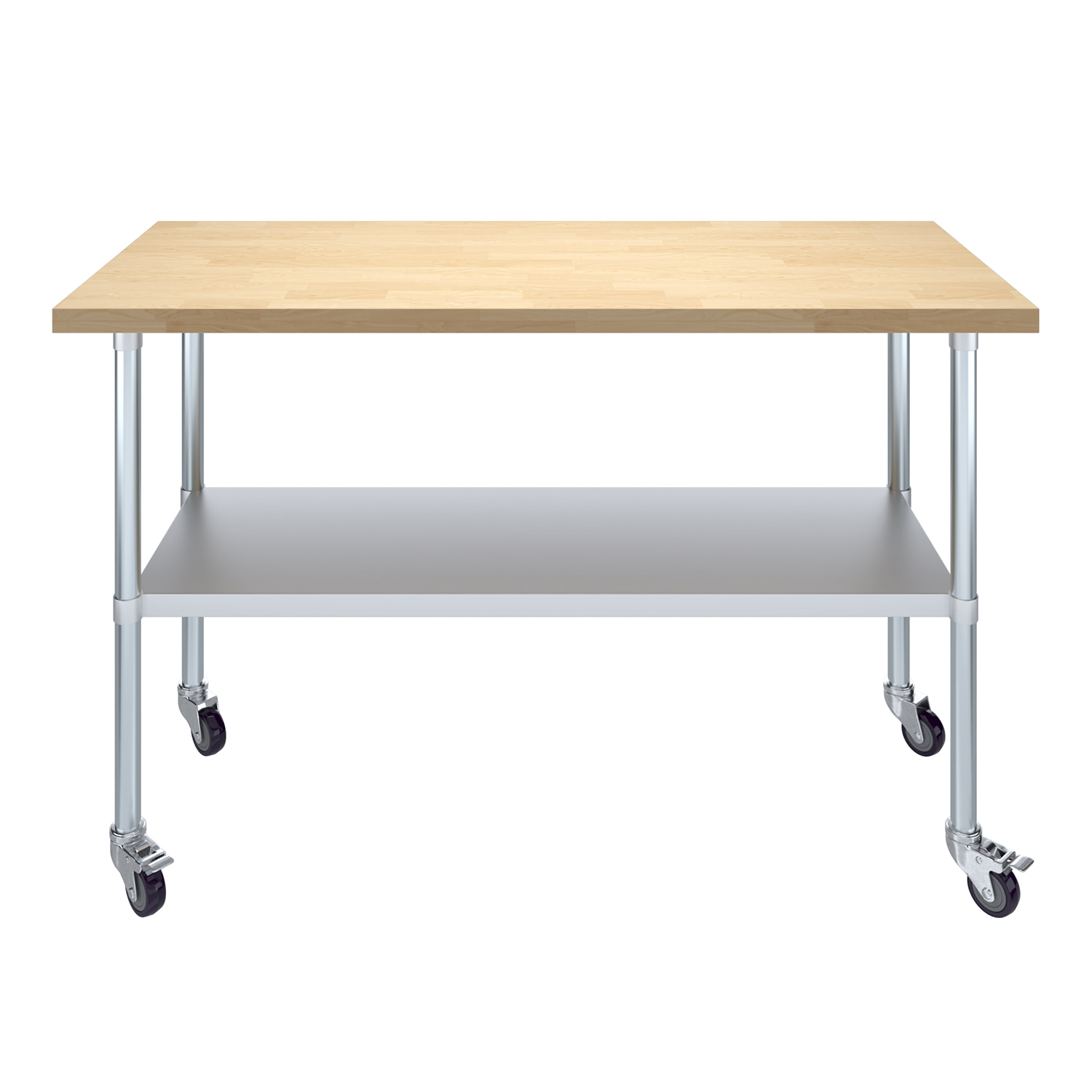24″ X 60″ Maple Wood Top Work Table with Adjustable Undershelf with Wheels