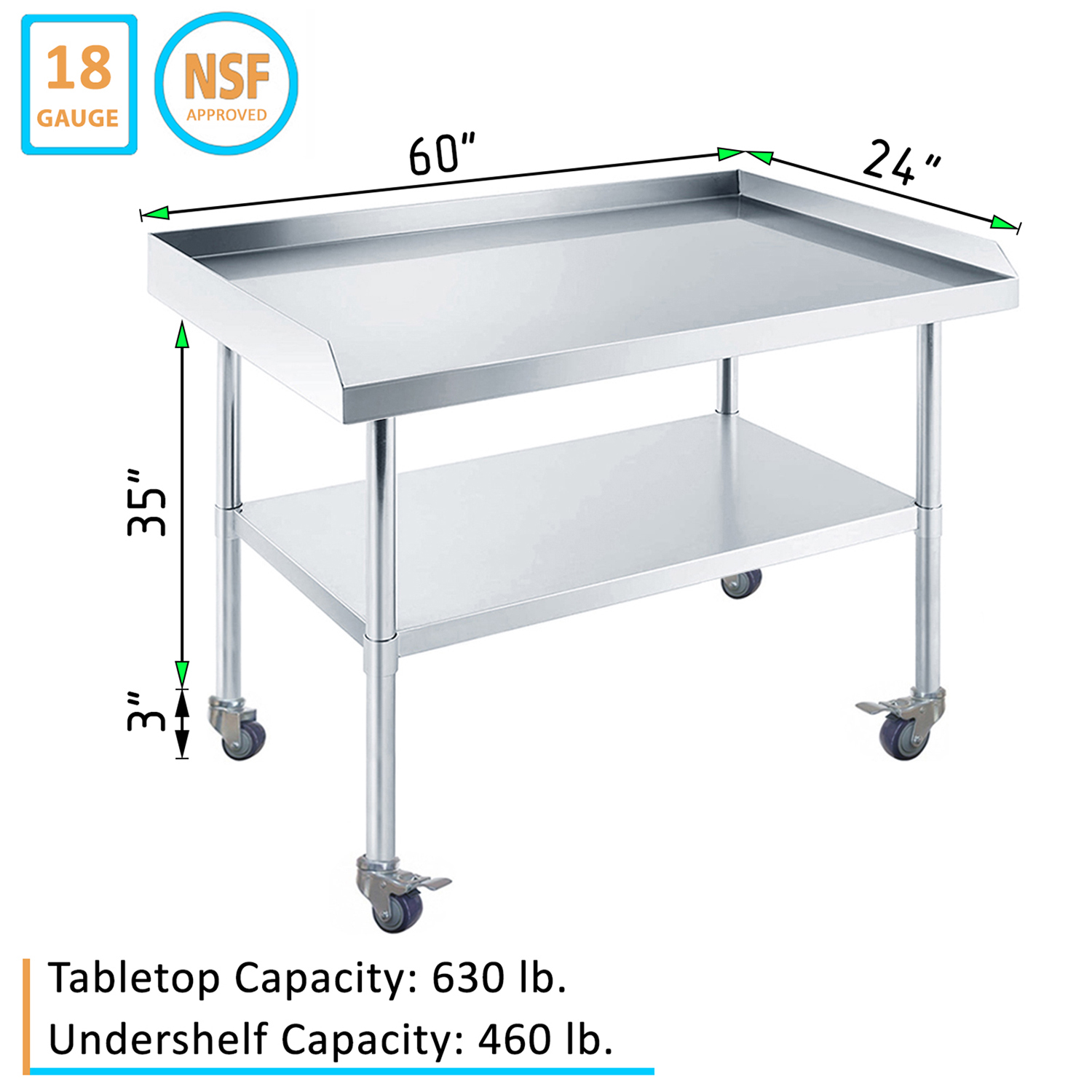 Enhance your kitchen’s efficiency and mobility with our 24″ x 60″ Stainless Steel Equipment Stand, designed with a set of four robust wheels for effortless movement. Constructed from 18GA/430 stainless steel, making it ideal for heavy-duty kitchen equipment such as mixers, slicers, and grinders. The durable construction ensures longevity and stability, while the sleek, polished finish adds a professional touch to any culinary workspace.