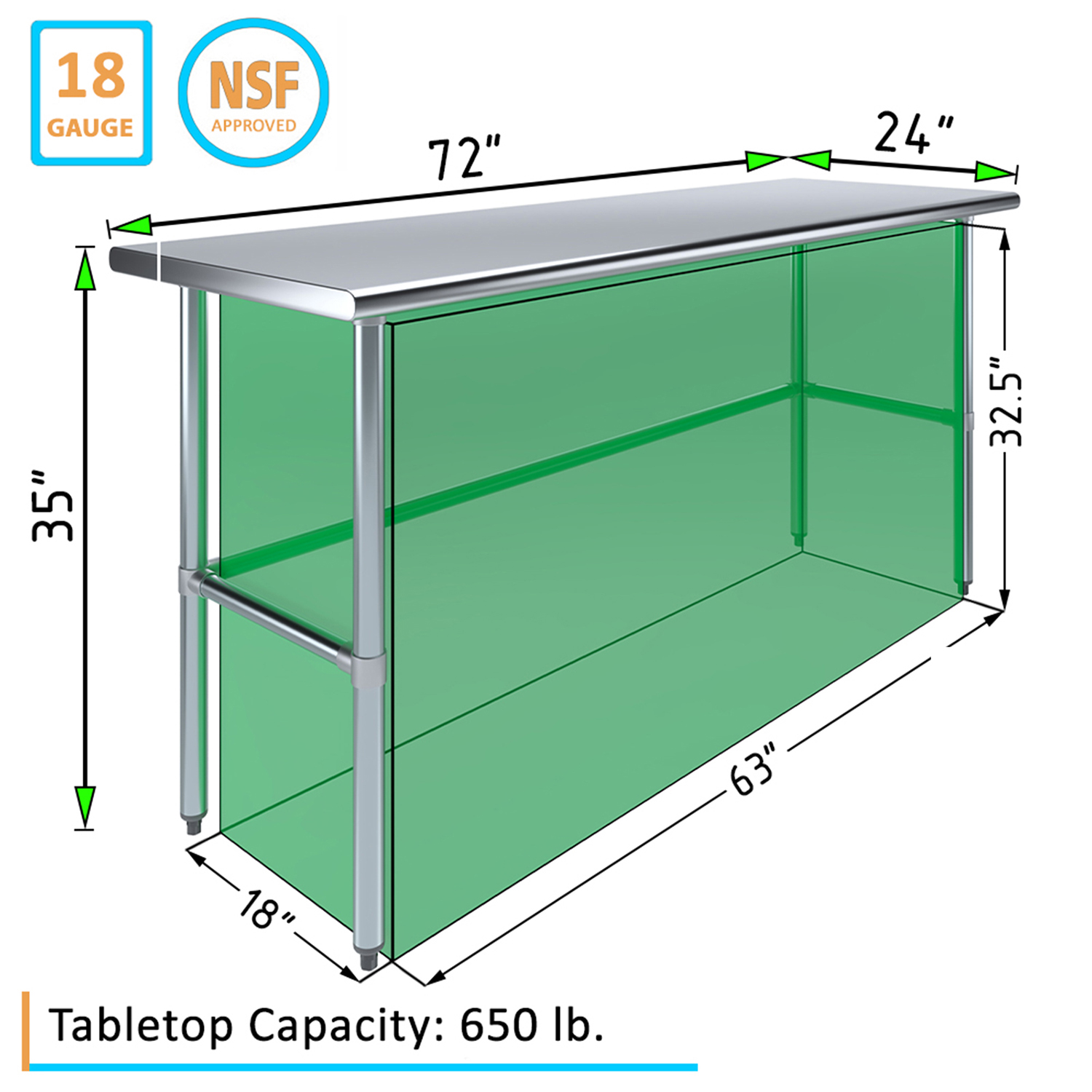 Enhance your workspace with the versatile and durable 24″ x 72″ Stainless Steel Work Table with Open Base. Crafted from 18GA/430 stainless steel, this work table is designed to withstand the rigors of daily use in commercial kitchens, workshops, laboratories, and other demanding environments. Its sleek, smooth surface is not only easy to clean but also resistant, ensuring long-lasting performance and hygiene.