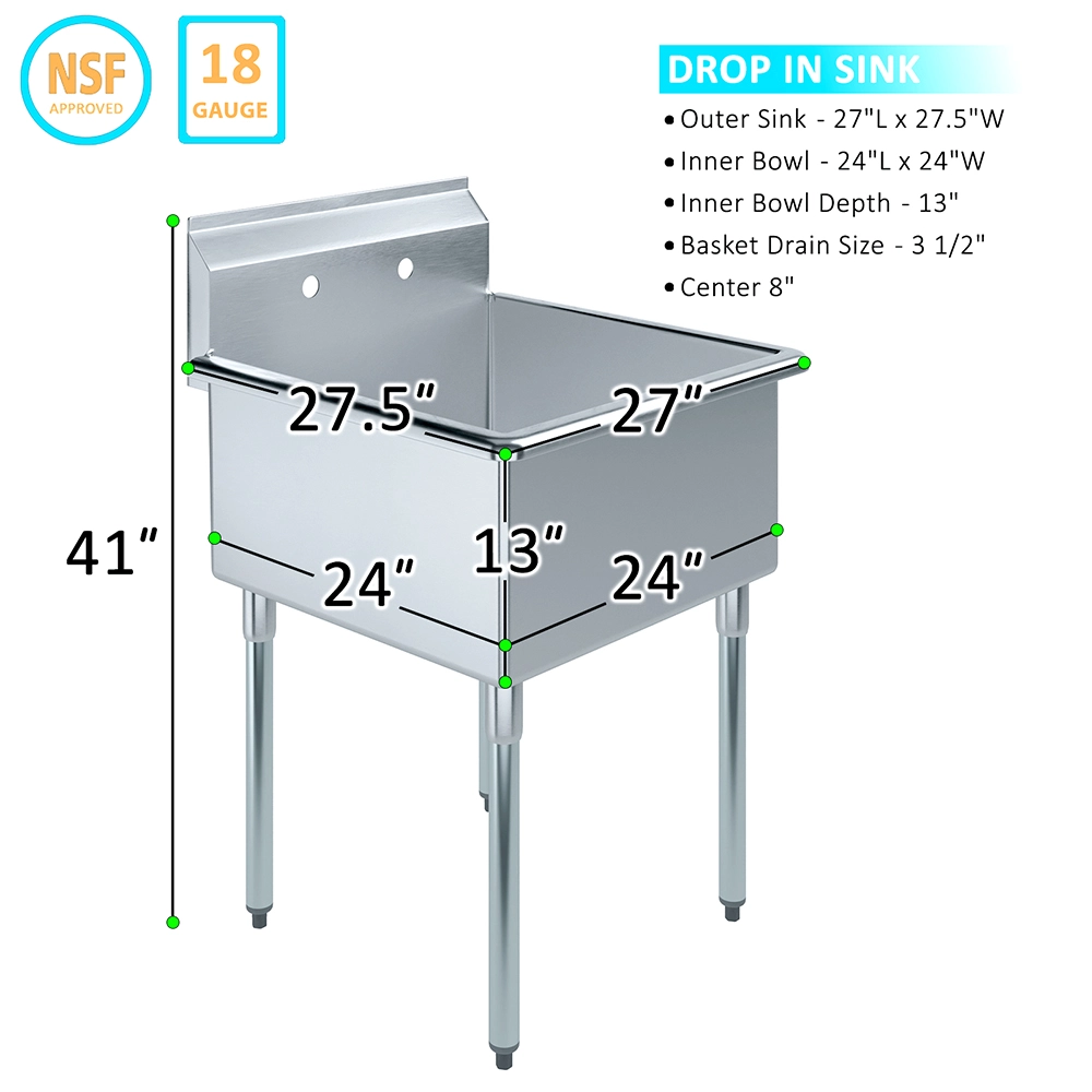 Optimize your workspace with the 27 in. x 27 1/2 in. Stainless Steel Utility Sink, a durable and versatile solution for heavy-duty cleaning tasks. Crafted from 18GA/304 stainless steel, this utility sink is designed to resist stains, and wear, ensuring long-lasting performance in demanding environments such as commercial kitchens, workshops, garages, and laundry rooms.